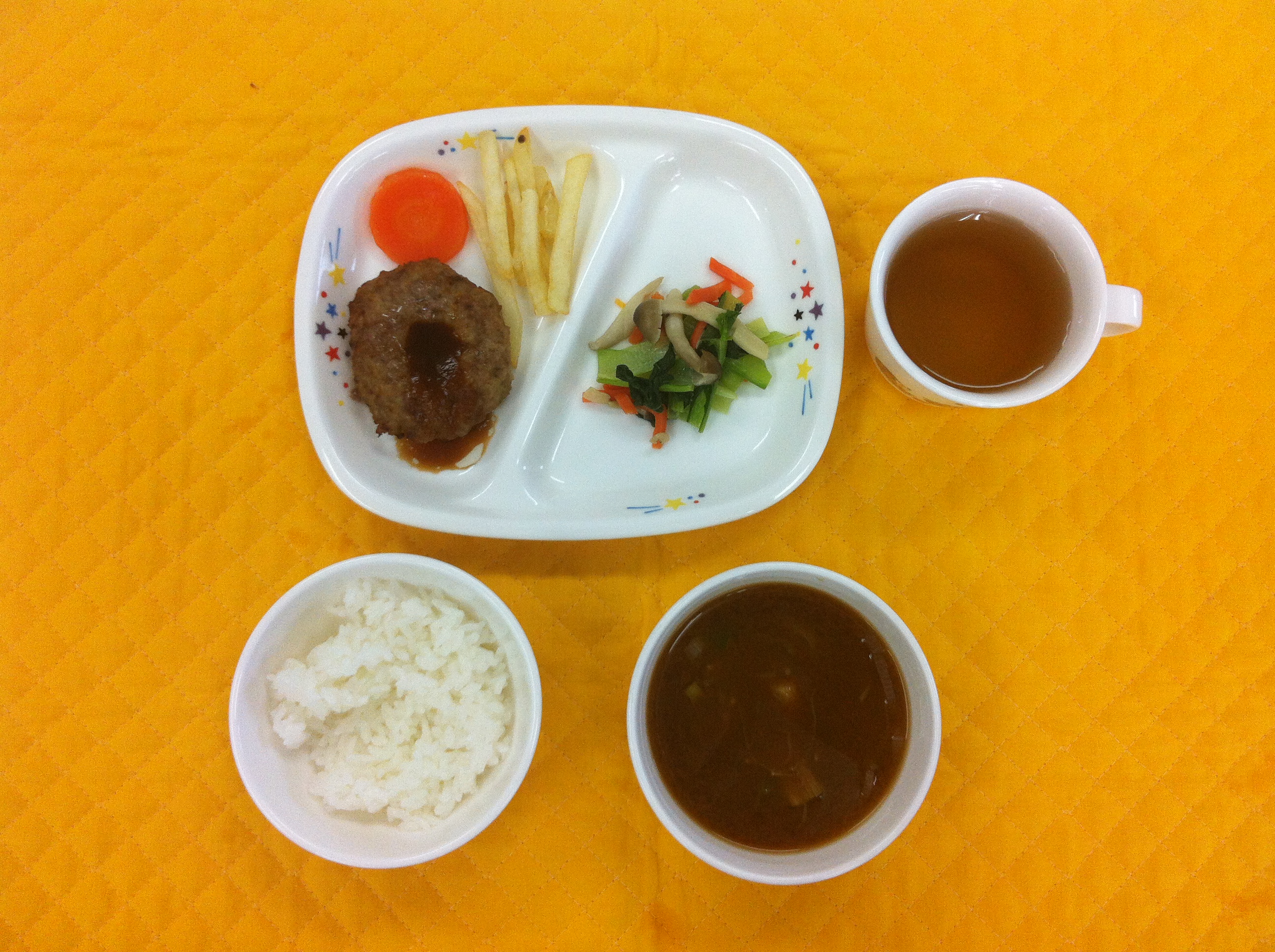 今日の給食は、ハンバーグです。玉ねぎをよく炒め、パン粉、卵、牛乳を入れよく混ぜて蒸し焼きにしました。蒸し焼きにすることで、よりふっくらジューシーに仕上がりました。小松菜のソテーは、苦みが嫌がる子が多いので、気にならないようコンソメ、塩で味付けしています。