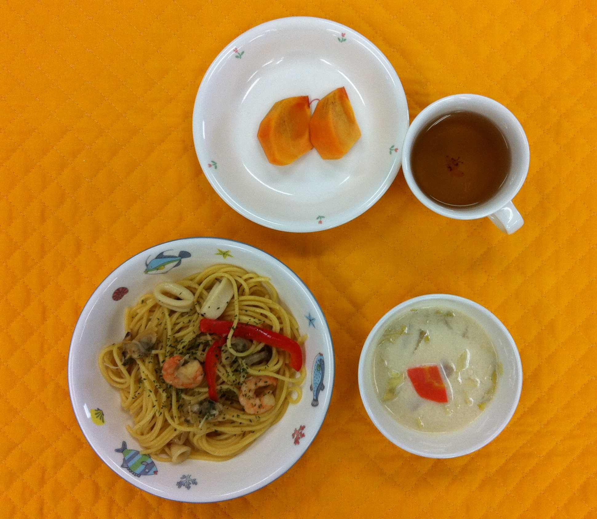今日の給食は、シーフードスパゲッティです。本園の給食は、調理したての給食を味わえるので、パスタも美味しいタイミングでいただくことができます。デザートは、柿が出ました。