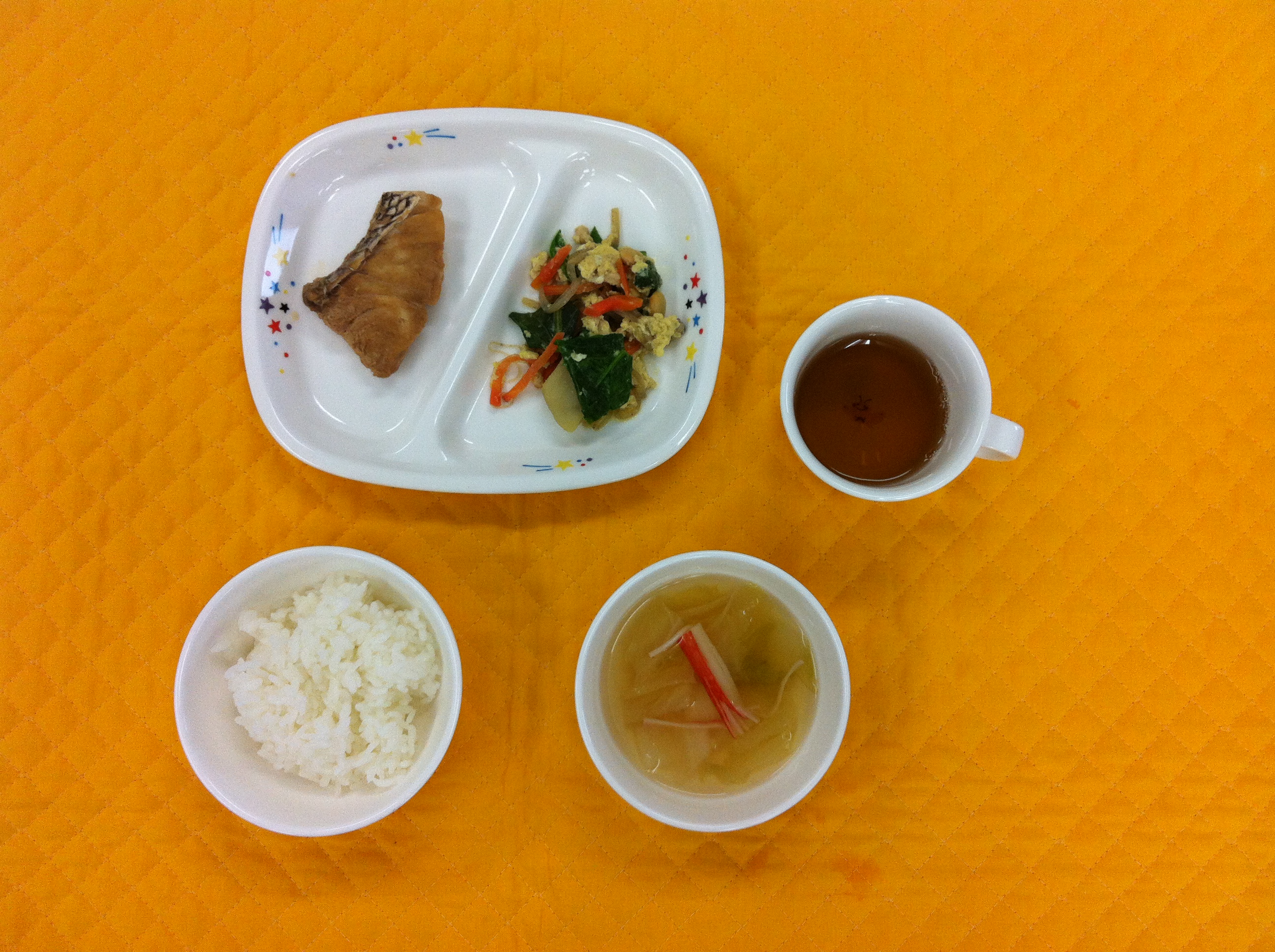 今日の給食は、鯛の煮つけです。冬野菜の卵とじが色をそえました。小松菜と白菜は園で採れたものです。