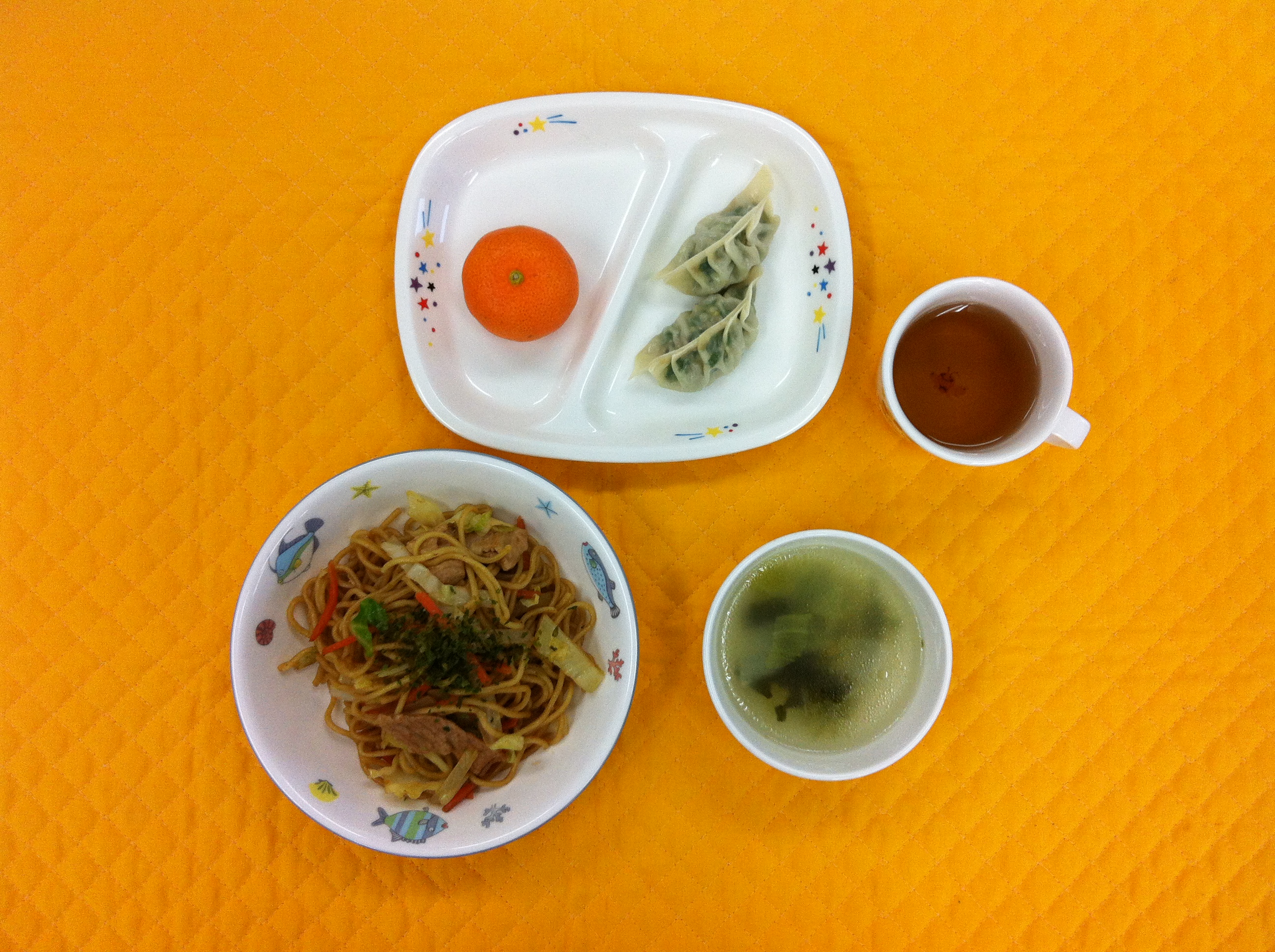今日の給食は、焼きそばです。人気メニューの定番ですね。ミカンは、愛媛県産を使用しています。