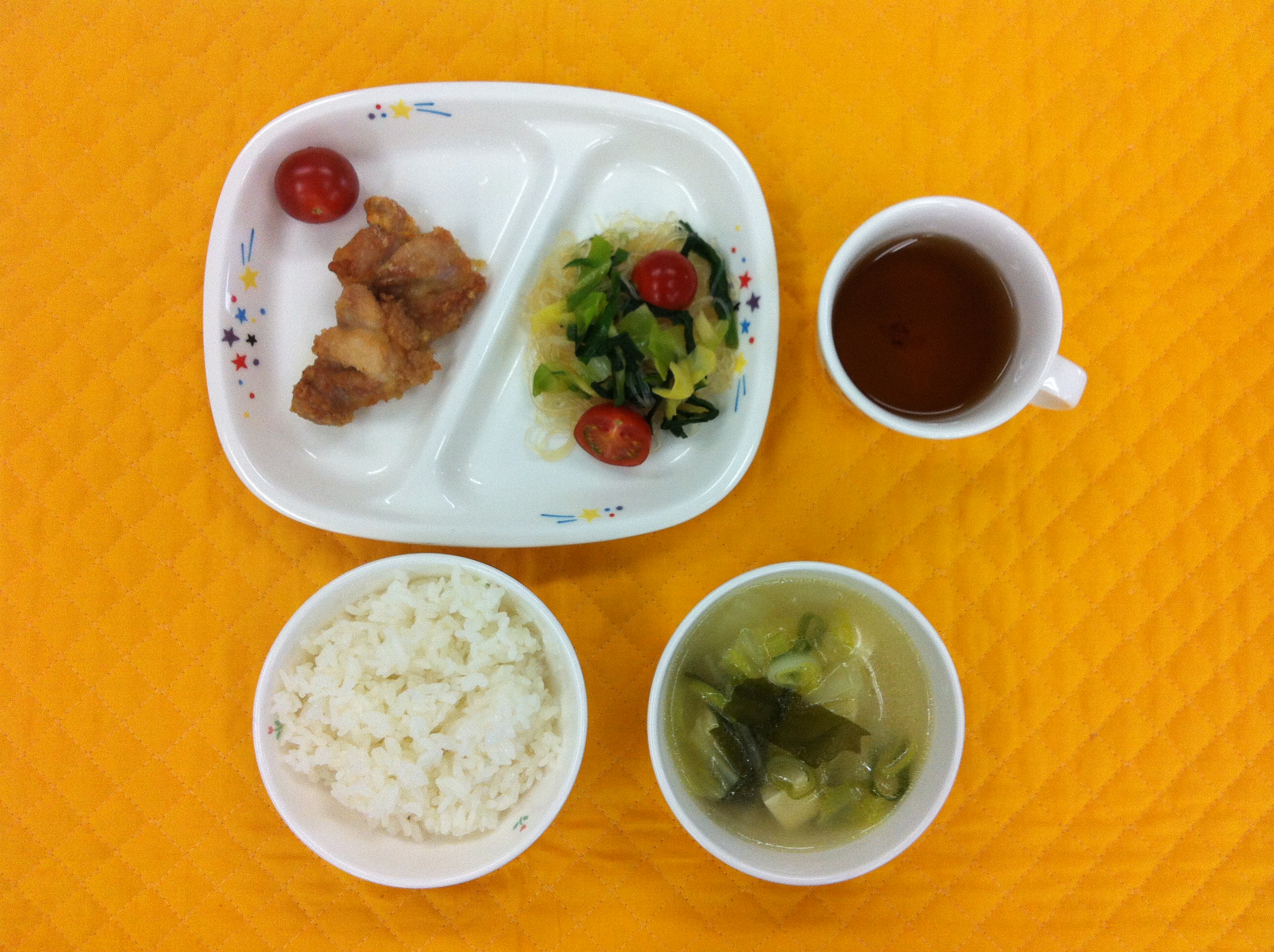 子どもたちの大好物から揚げです。下味に鶏の臭みをとるため、すりおろしたしょうがを沢山いれました。から揚げは揚げず、オーブンで揚げ焼きにしてみました。鳥の脂がでて、ジューシーに仕上りました。スープには、豆腐、大根、白菜、わかめ、ネギと具沢山です。中華スープと、しょうゆで味付けました。