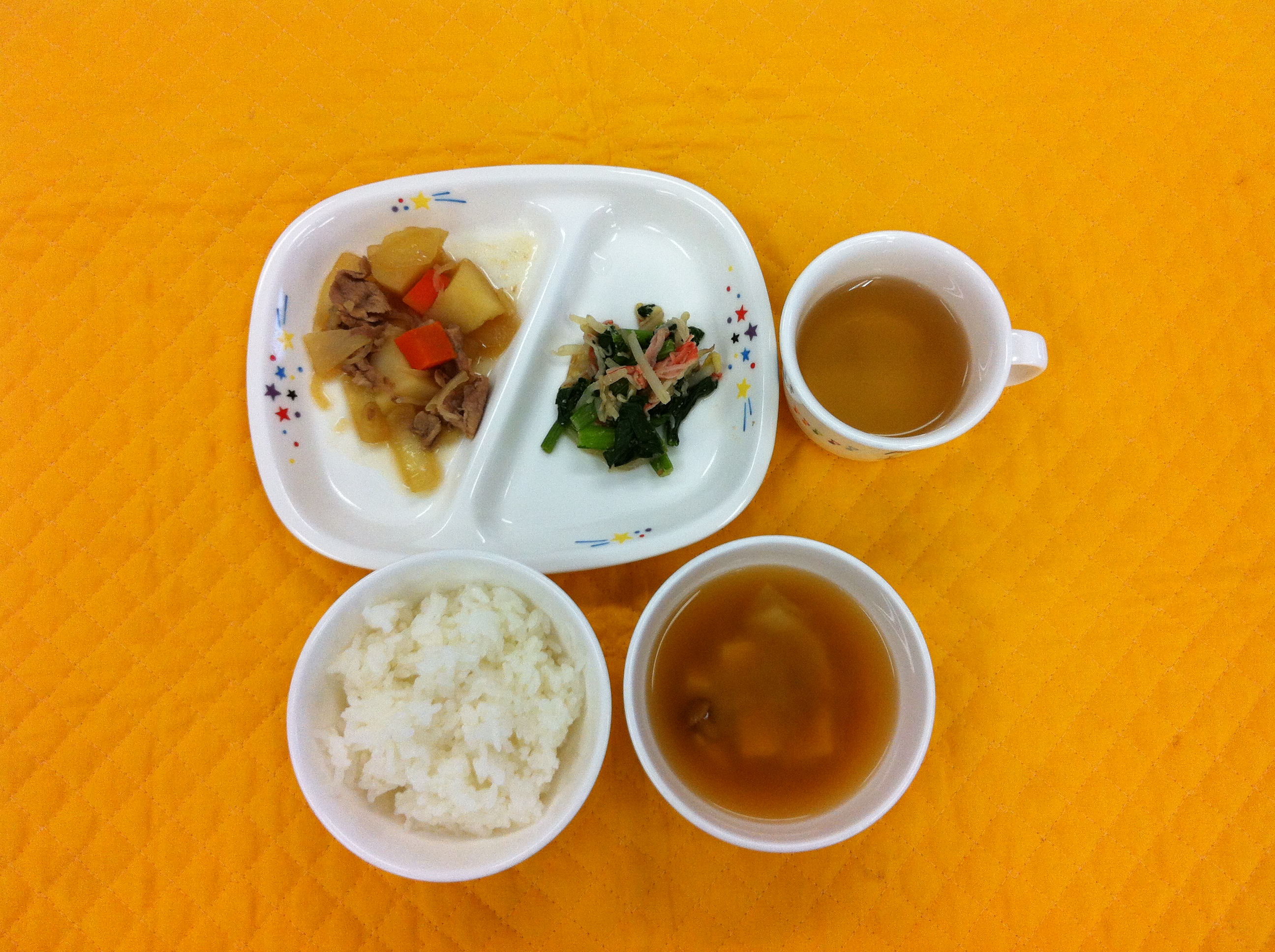 今日は、野菜たっぷりの和風メニューです。 じゃが芋、人参、ほうれん草、小松菜とたくさん入ってますが子ども達はしっかり食べてくれました。
