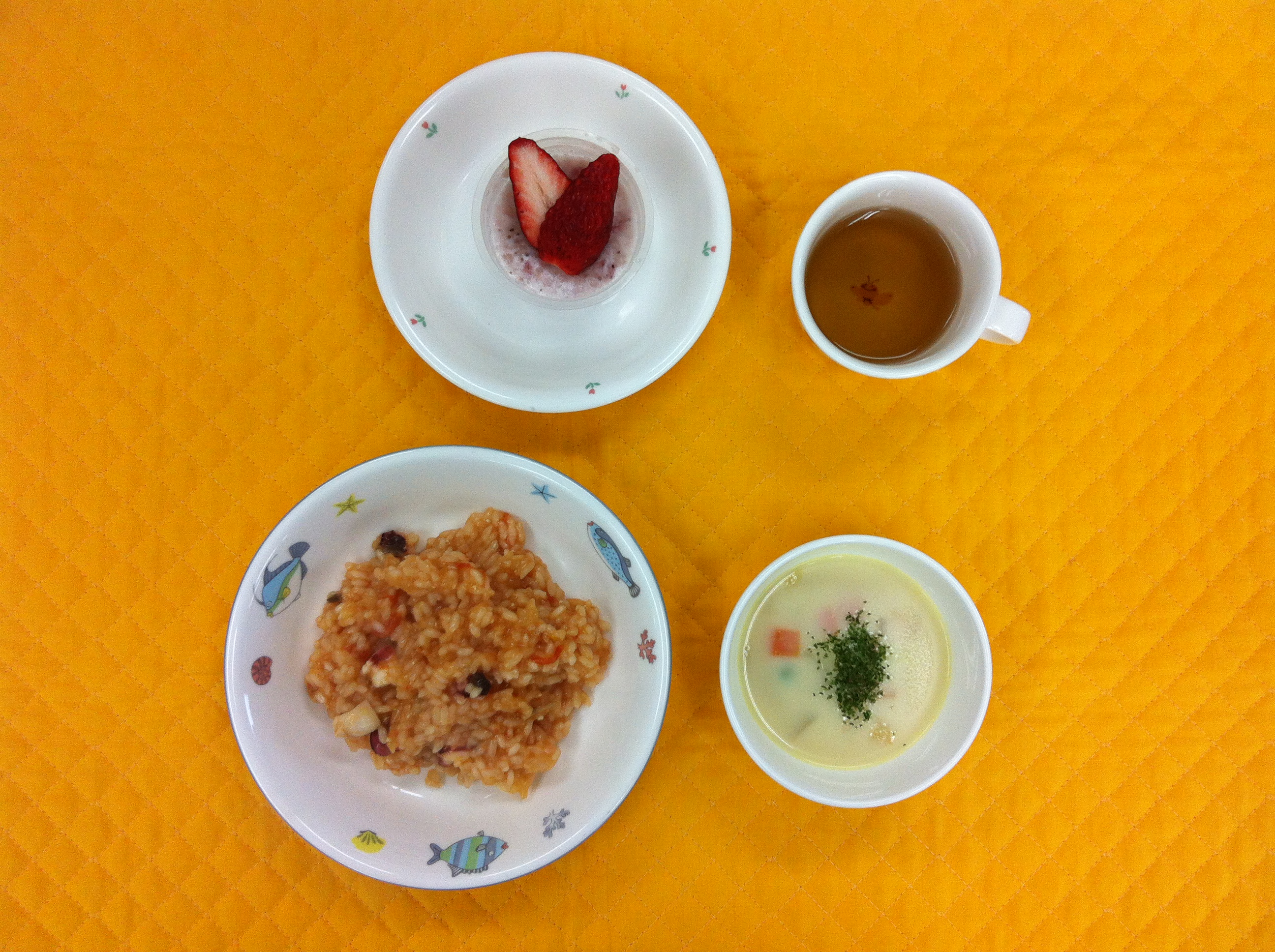 今日の給食は、タコリゾットです。初めてのメニューです。米をトマトピューレ、コンソメ、白ワイン、水で煮込みました。タコは加熱しすぎると固くなるので、火が通る程度に加熱しました。粉チーズをふんだんに使いコクを出しました。いちごミルクゼリーは、小さく切ったいちごをゼリーの中に入れました。いちご好きな子が多く美味しそうに食べていました。 |