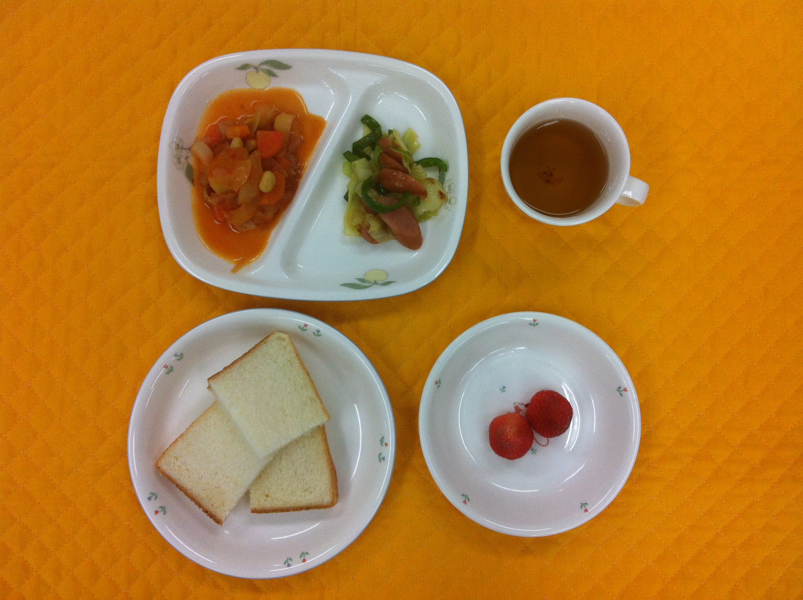 今日の給食は、ポークビーンズです。野菜を柔らかく食べやすいよう、炒めてから、蒸し焼きにしてケチャップソースを入れ味を染み込ませませた。子どもたちに食べやすいトマト味に仕上げました。今旬の甘い苺も嬉しそうに食べていました。 |