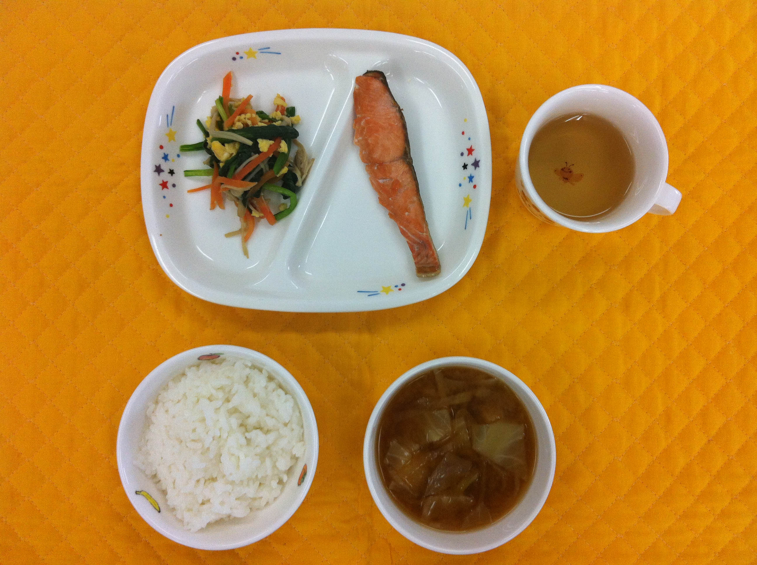 今日の給食は、鮭の塩焼きです。鮭に少し塩を振り焼きました。焼きすぎると固くなるので、焼き加減を気を付けました。みそ汁は、切干大根、新玉ねぎ、キャベツ、油揚げが入り具沢山です。切干大根の甘味が出て、子ども達もよく食べてくれました。