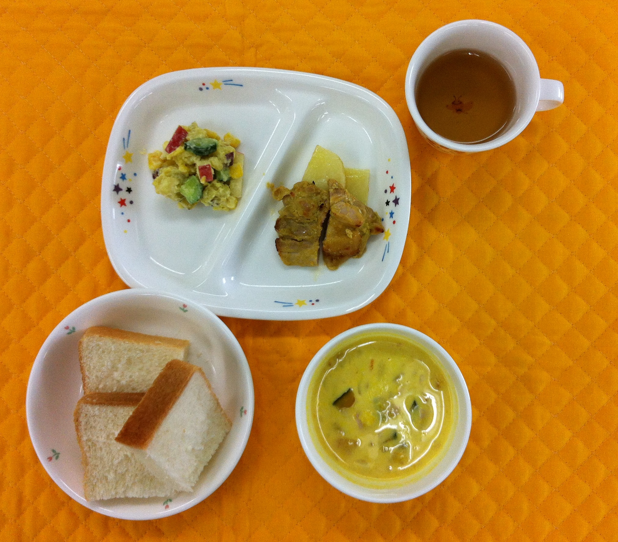 今日は、カレーとヨーグルトに漬け込んで焼いたタンドリーチキンです。ほんのりとしたカレー味のチキンと、ほっこり甘いかぼちゃのミルクスープは子どもたちに人気でした。