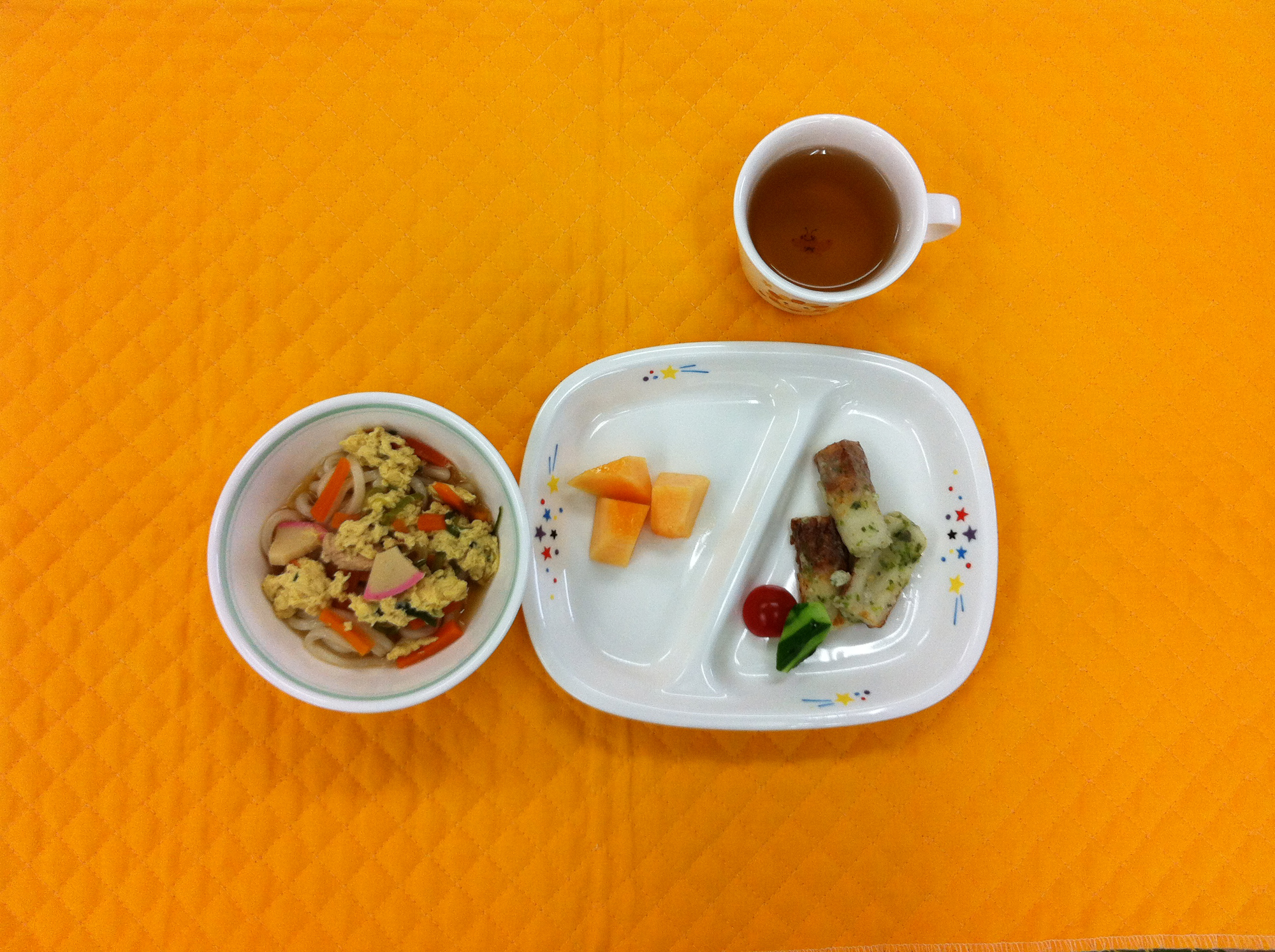 今日は鶏肉と卵と野菜を入れた親子うどんです。うどんを2回おかわりする子もおり好評でした。やはり、麺類は子どもたちに人気なんですね。デザートのメロンもジューシーで甘く人気でした。 |