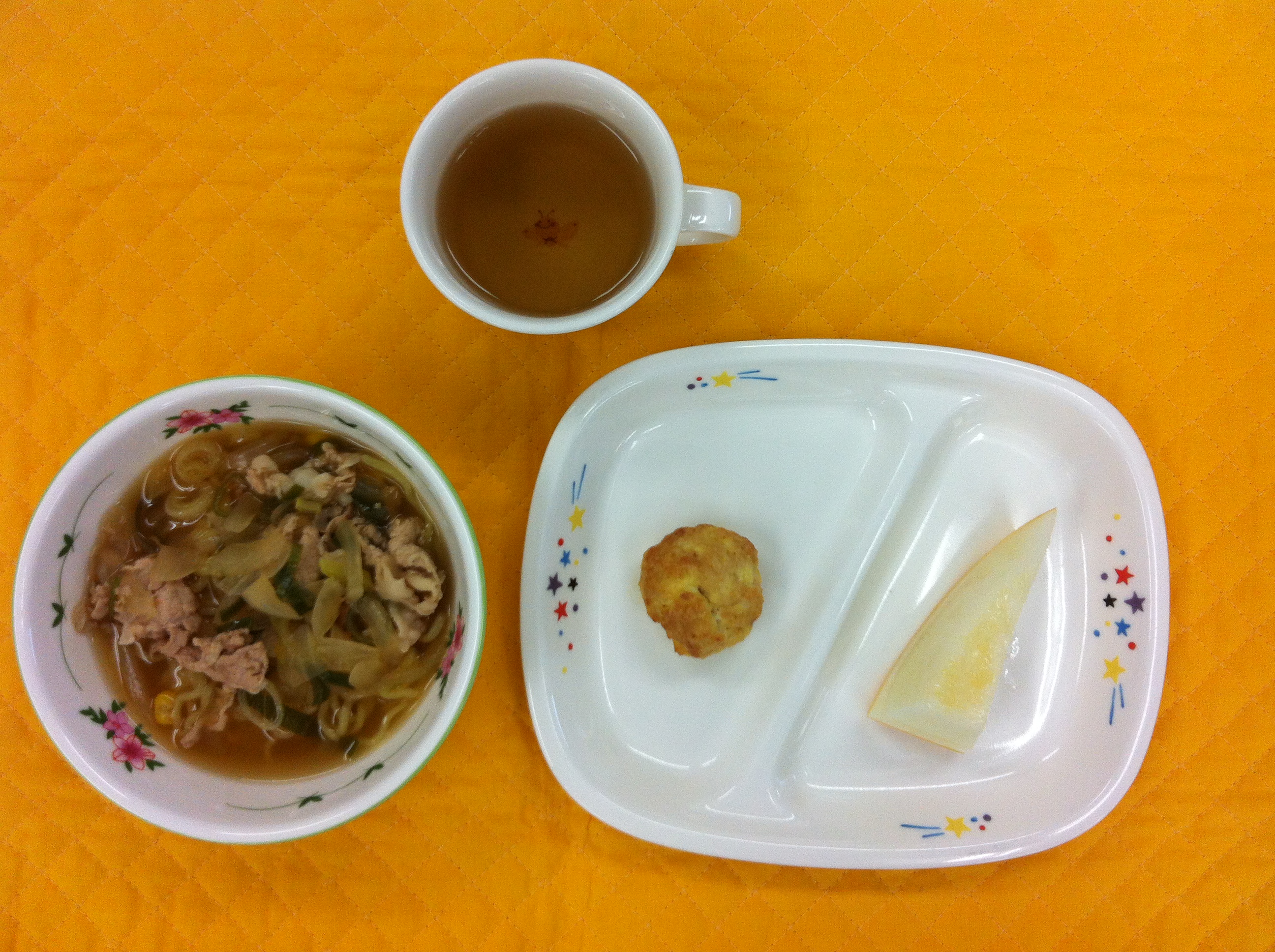 今日の給食は、肉ラーメンです。たっぷりのお肉、園で採れた新玉ねぎを炒め、中華スープ、醤油で味付けしました。豆腐のつくねは、豆腐、鶏ミンチ、醤油、生姜で味付けしました。生姜を多めに入れたので、生姜の香りが出て、肉の臭みも消え、ヘルシーに出来上がりました。 |