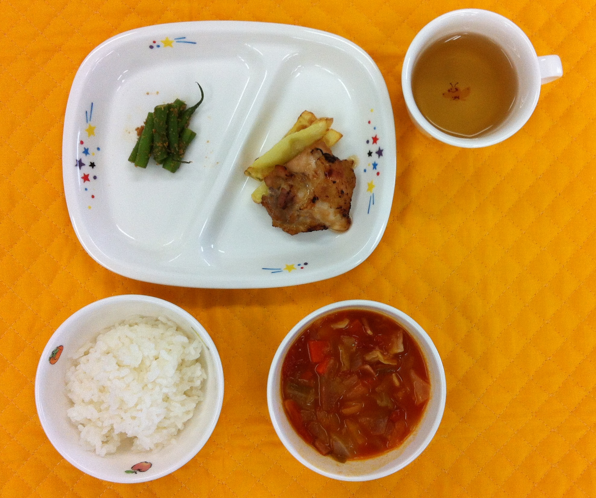 今日は、チキンソテーとポテトが人気でした。子どもたちが食べる様子を見ていると、まずポテト→チキンソテー→ミネストローネ→インゲン胡麻和えの順番に食べていました。また、ミネストローネが大好きな子は、「more please!」と言っておかわりをしていました。 |