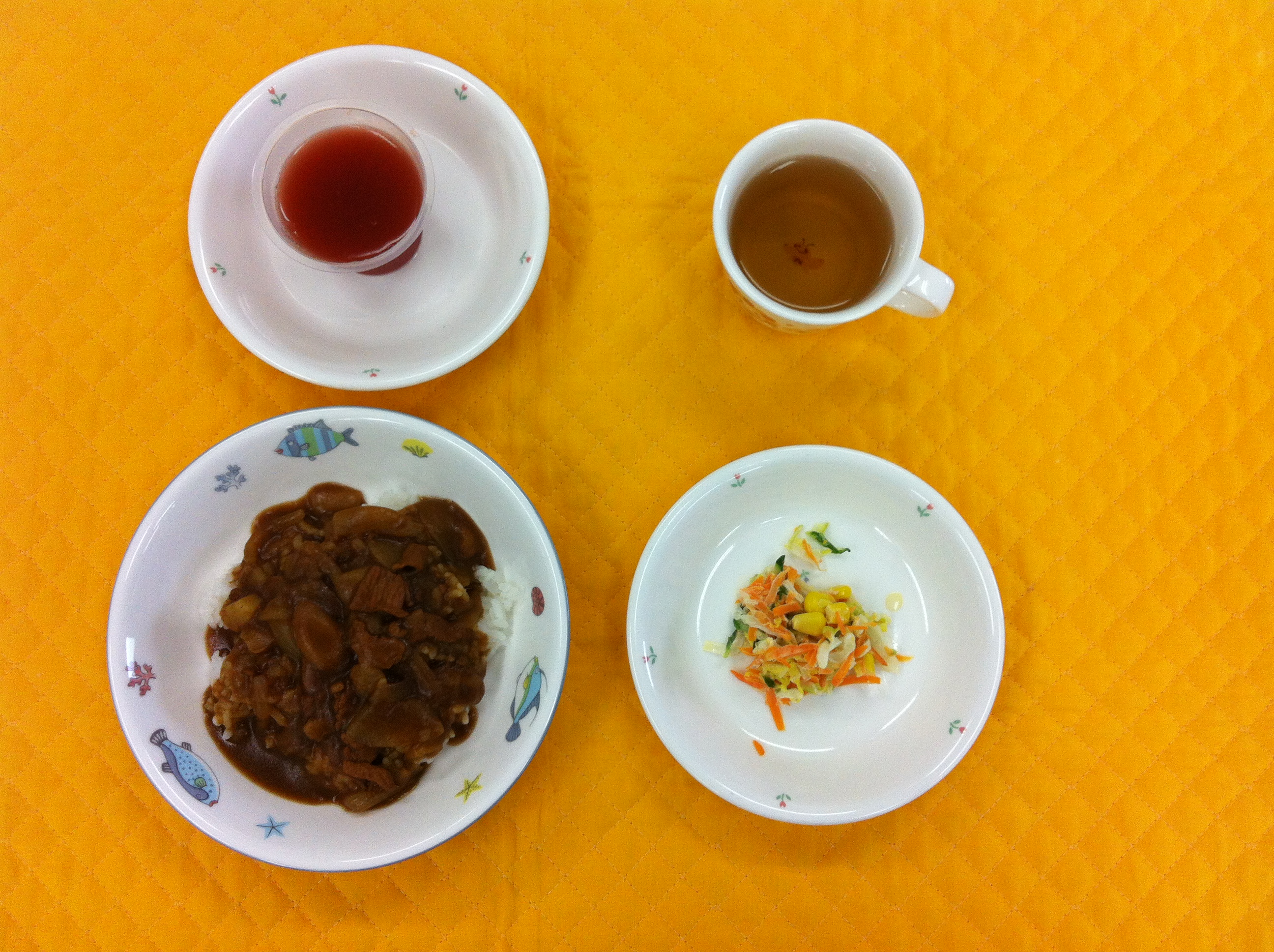 今日の給食は、ハヤシライスです。よく炒めた玉ねぎ、じゃが芋、マッシュルーム、お肉を煮込み、ルーで味付けしました。子どもたちに食べやすいよう、薄味に仕上げました。ゼリーは、野菜ジュースを使ってゼリーを作りました。