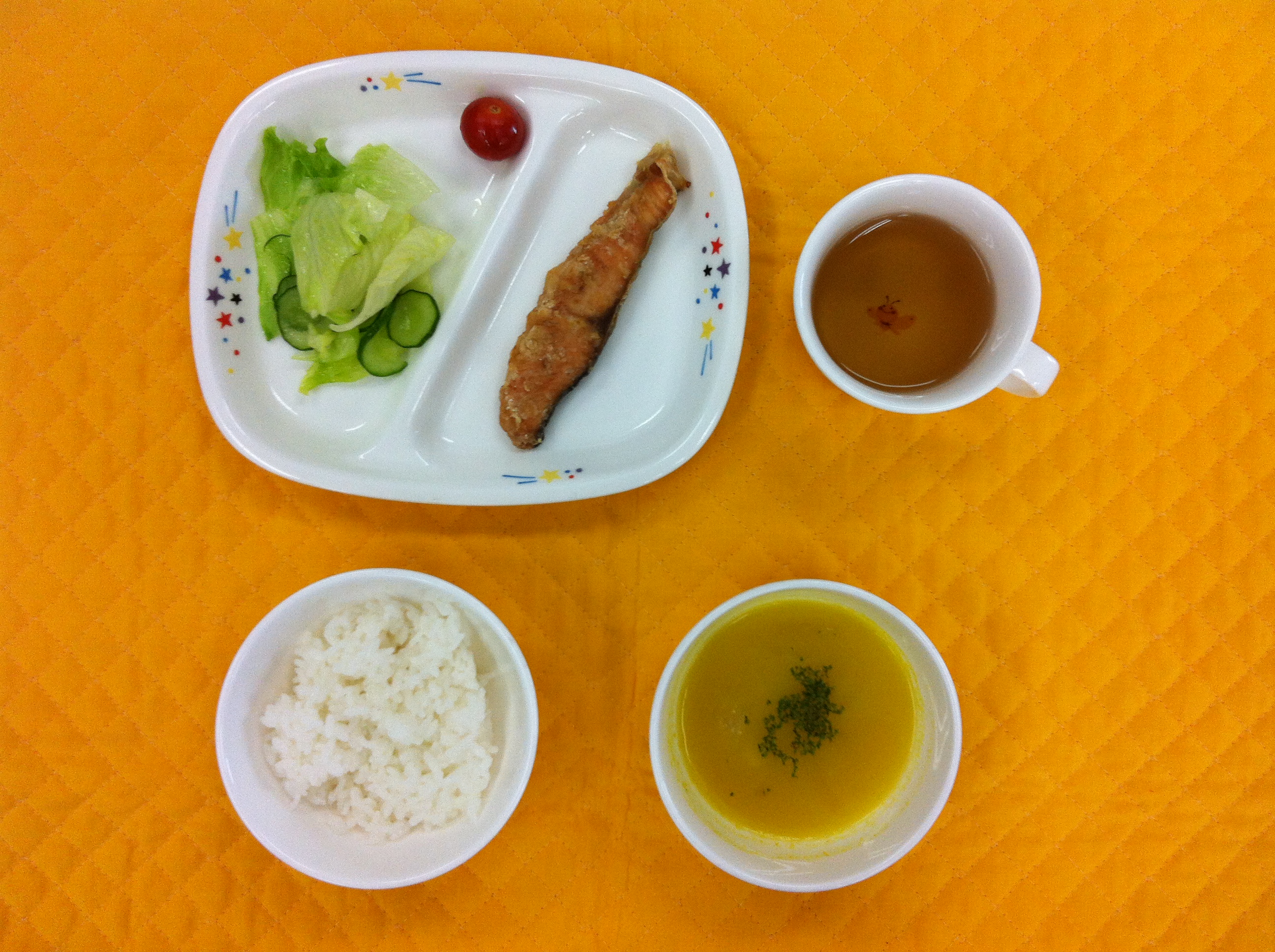 今日の給食は、鮭のムニエルです。塩コショウをし、小麦粉をつけ、オーブンでかりっと焼きました。パンプキンスープは、パンプキンペーストを使ってスープを作りました。かぼちゃの甘さがでたスープになりました。