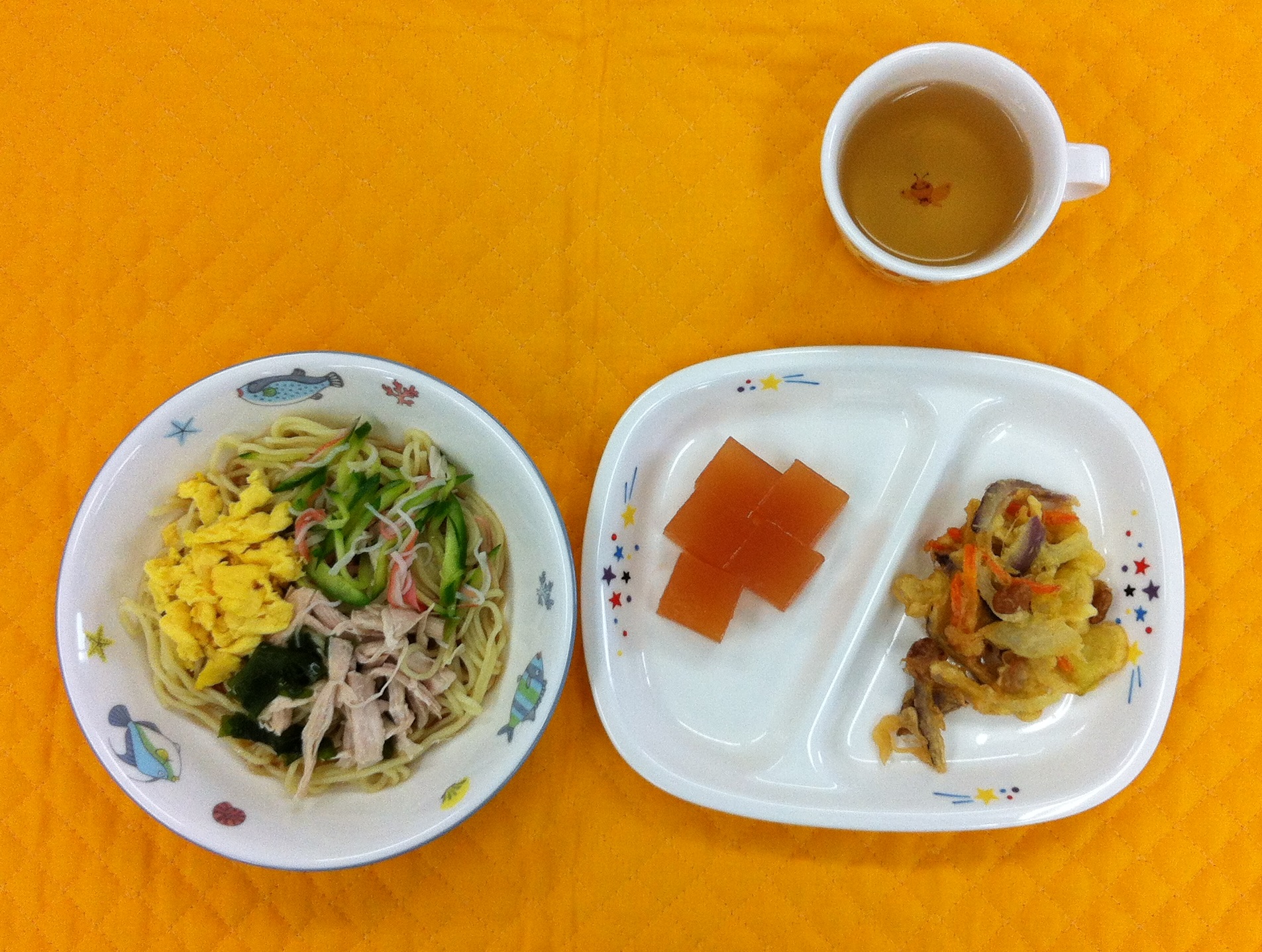 今日は、5種の具材を載せた冷やし中華です。子どたちが食べやすいように酢を控えめにした醤油ベースのつゆにしました。教室は、いい風が入るのでまだ暑くはないですが、冷たい麺を美味しそうに食べていました。裏ごししたトマトとりんご果汁で作った寒天ゼリーも、のど越しがよく人気でした。