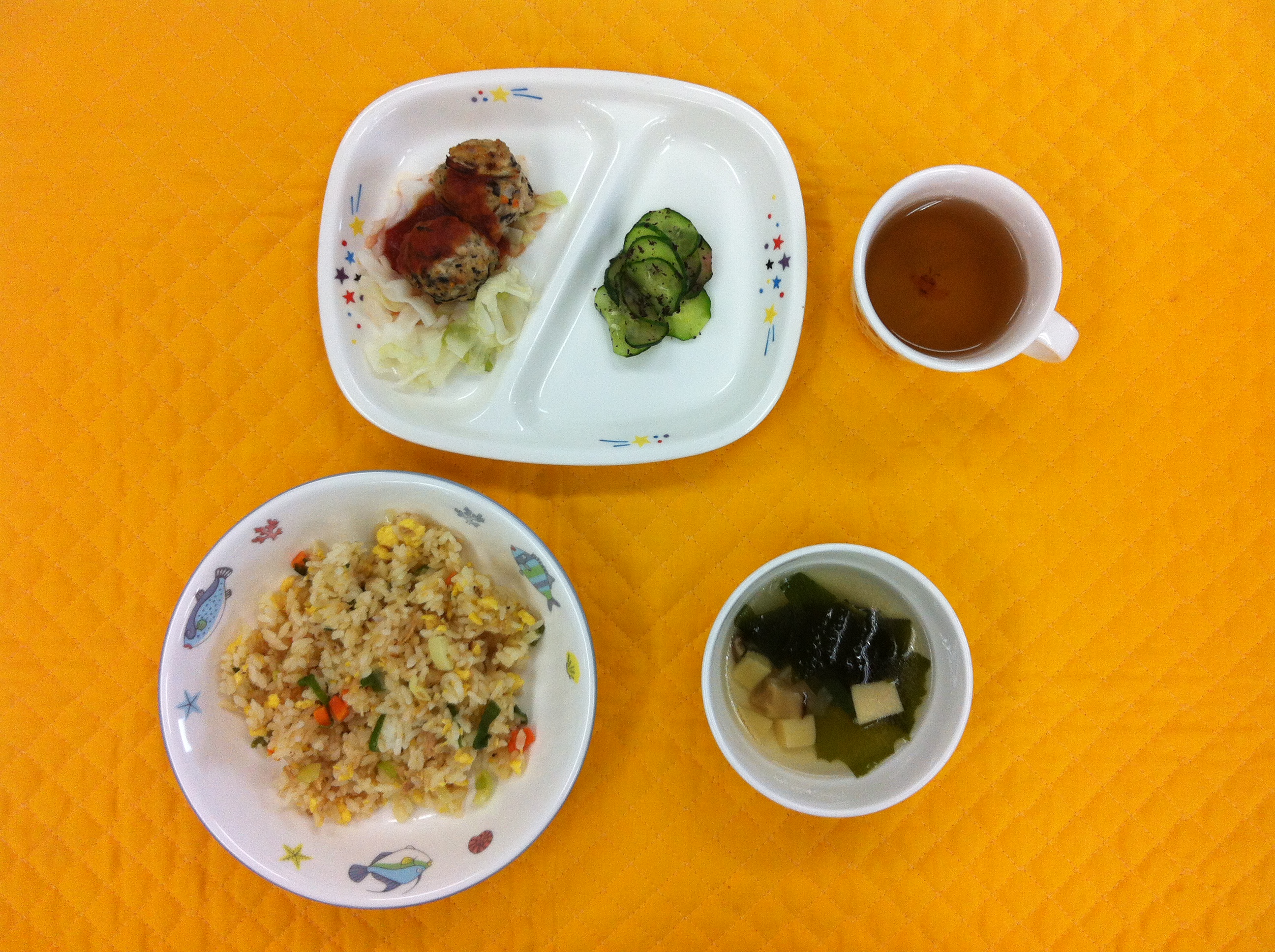 今日の給食は、ツナ炒飯です。ツナ、人参、ピーマン、ネギ、卵を固めに炊いたご飯と炒めました。醤油、塩のみで薄味の味付けです。鶏つくねは、人参、ひじきを沢山入れ団子を作り、上からチャップソースをかけました。 |