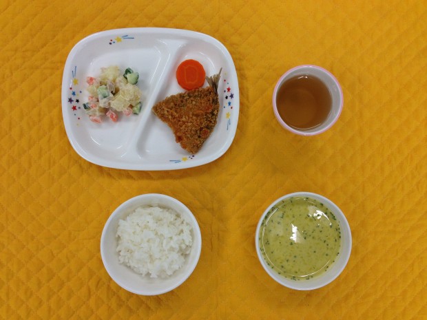 今日の主菜はアジフライです。スープは、みじん切りした玉ねぎを甘みが出るまでよく煮てマッシュしたかぼちゃ・牛乳を入れ、味を整えた後仕上げに生クリームを入れて作りました。ポテトサラダは、蒸したジャガ芋をつぶさず、人参・きゅうり・ツナを入れマヨネーズで味付けしました。