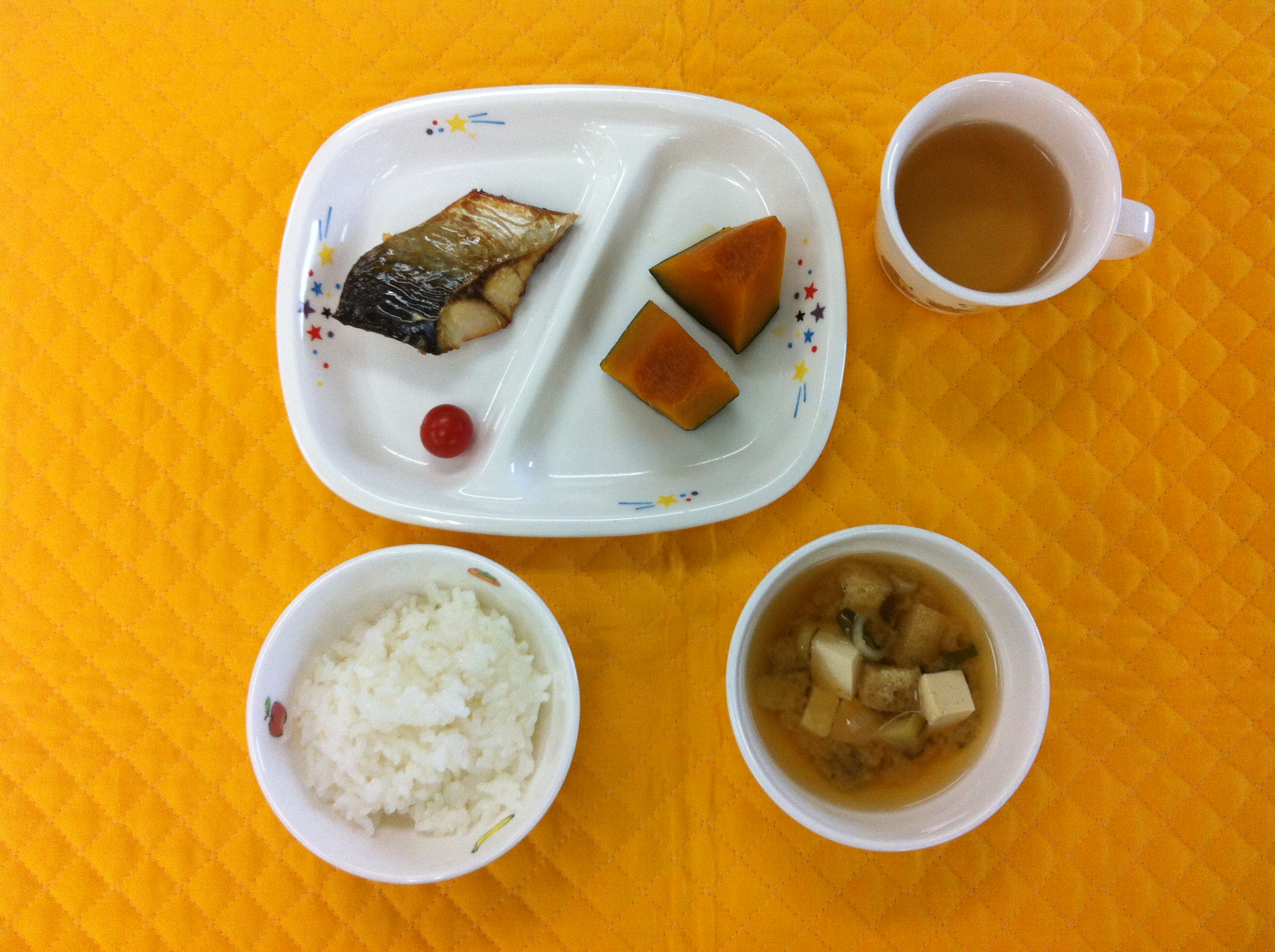 今日の献立は、鯖の塩焼き・かぼちゃの煮物・ごはん・みそ汁です。みそ汁に入って入るナスは、園内菜園で収穫したものです。 |