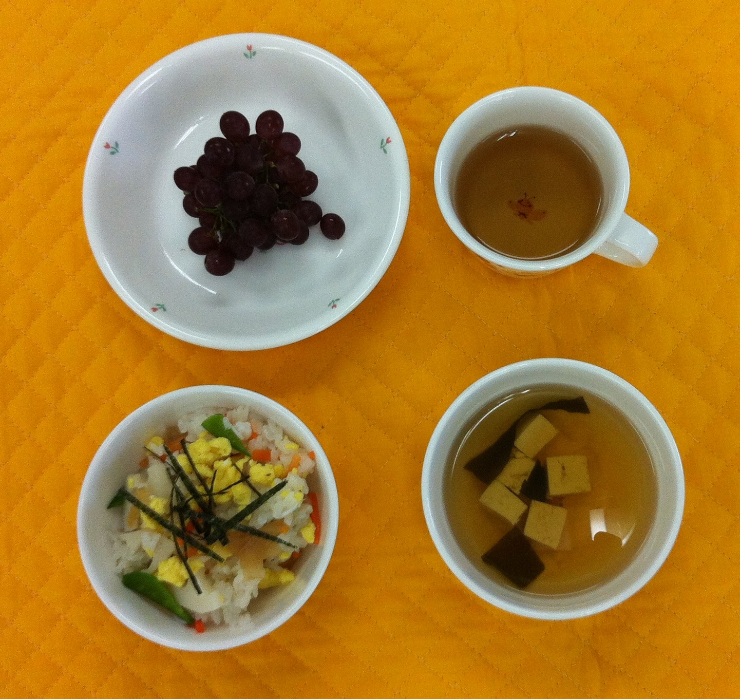 今日の給食は、ちらし寿司でした。いろどりが鮮やかで酢をひかえめにした、ちらし寿司は好評でした。そして、季節を感じられるブドウも人気でした。