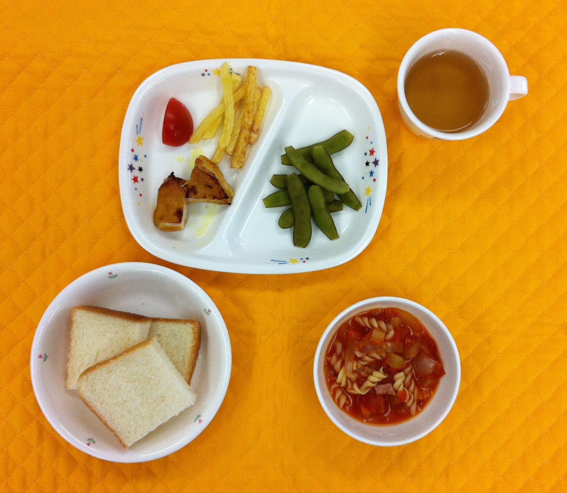 今日の汁物はミネストローネスープです。もう何回も出ている人気のスープですが、今日は、給食で初めてセロリを入れました。セロリ独特のさわやかな風味が感じられましたが、園児たちは特に気にしていないようでした。少しずつ色々な味を経験できるといいですね。 |