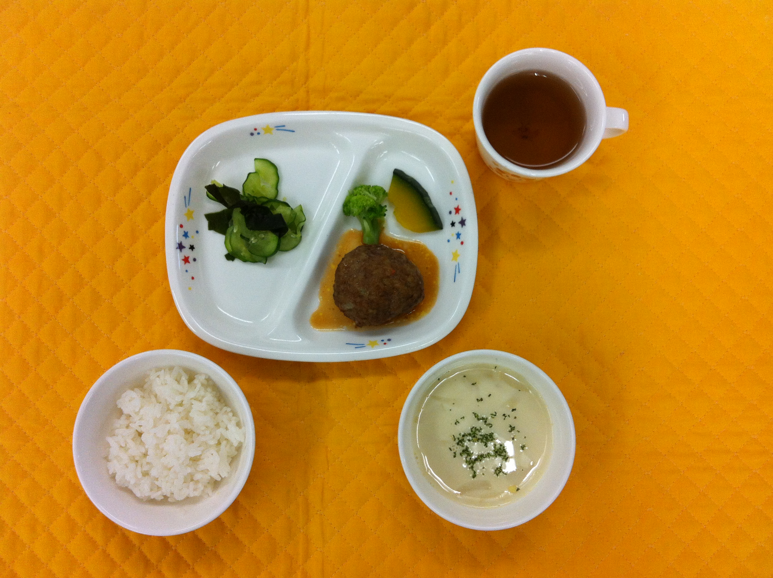 今日の給食は、ハンバーグです。子どもたちに大人気のハンバーグ。ソースはケチャップやウスターソースなどの調味料を合わせて、薄味に仕上げました。添えのかぼちゃと酢の物のきゅうりは園の畑で収穫したものです。コーンスープは牛乳をたっぷり使用し、甘めになっています。 |