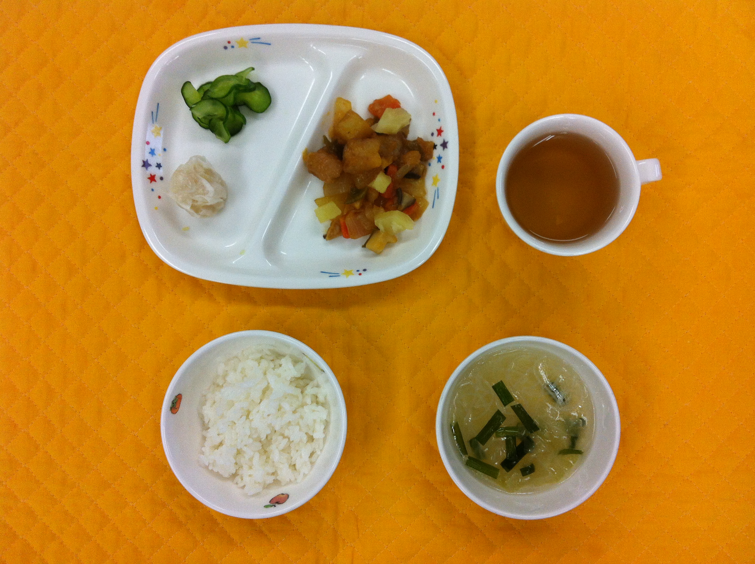 今日の給食は、酢豚です。豚肉に醤油、酒で下味を付け揚げ、じゃが芋も揚げ、中華スープで野菜を煮て、とろみをつけました。じゃが芋を揚げることにより、スープを吸って、食べやすくなりました。キュウリは、校内で採れた物を使いました。 |