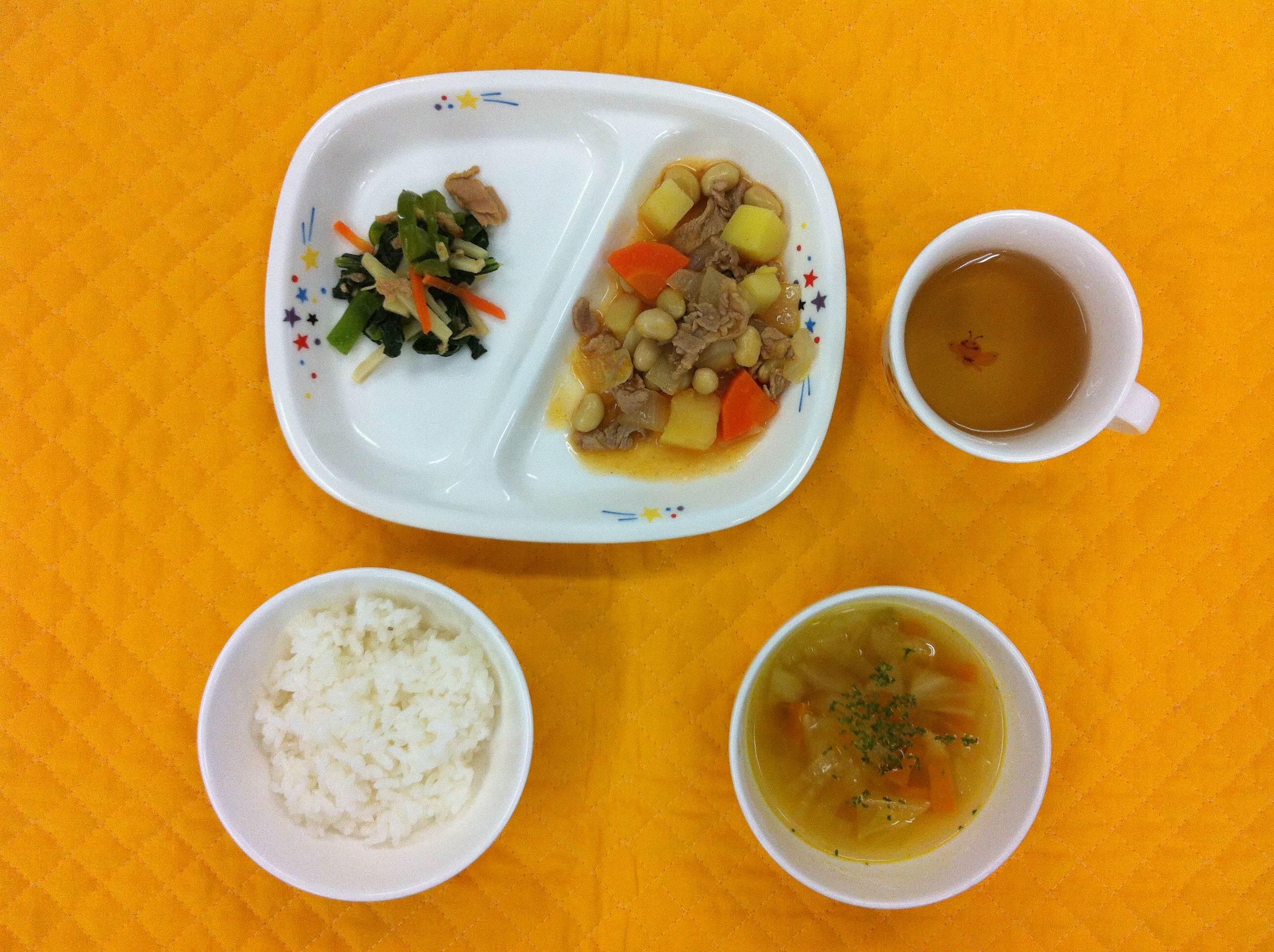 今日の給食は、ポークビーンズです。タンパク質が豊富に含まれている大豆をたっぷり使いました。味付けは、コンソメ、ケチャップ、砂糖、塩です。小松菜のソテーには、小松菜、シーチキン、人参、ピーマン、タケノコが入っています。薄味に塩で味付けしています。 |