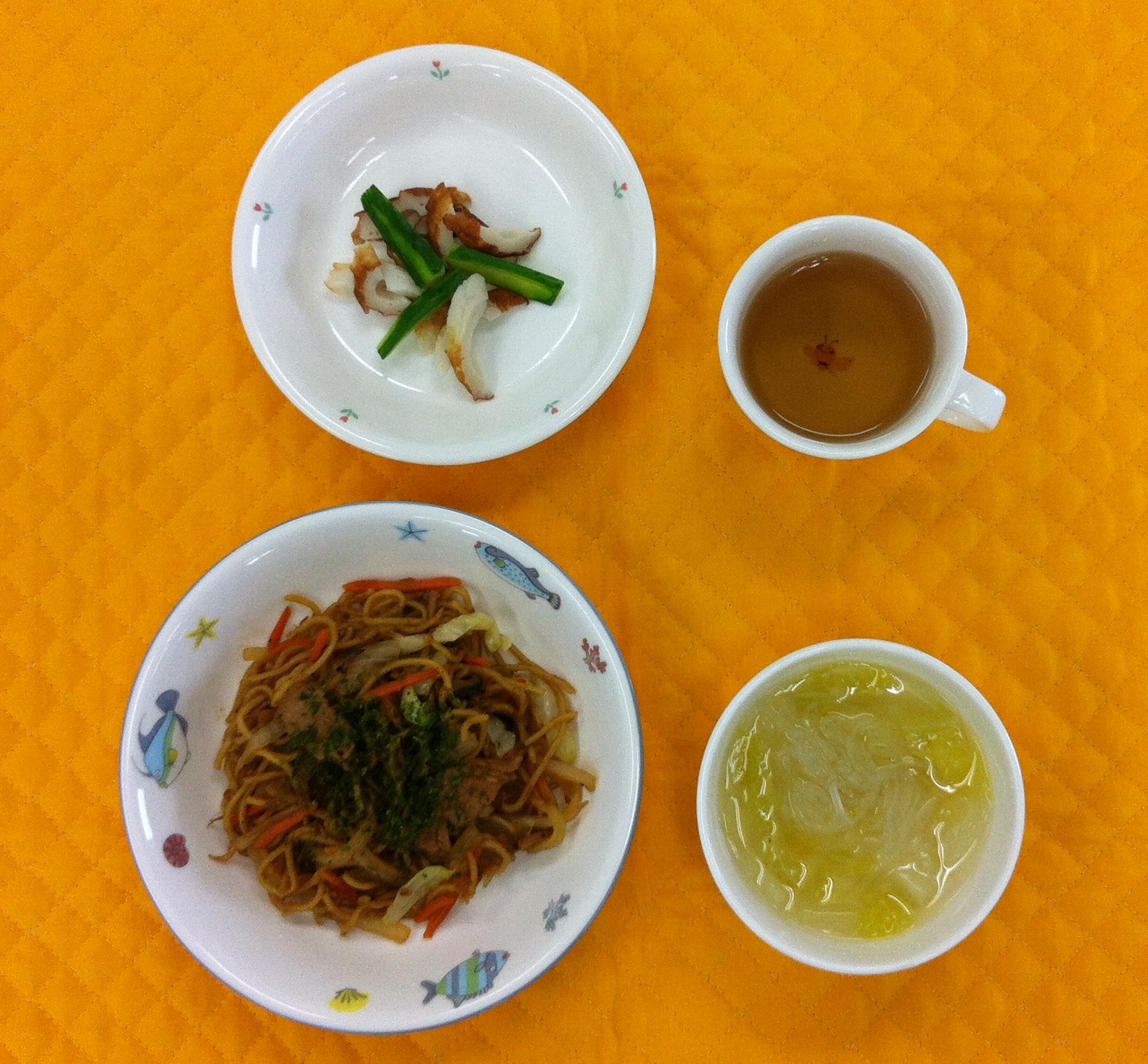 今日は、子どもたちに人気のソース焼きそばでした。白菜のスープは、塩味でサッパリした味付けでした。スープに入っている春雨は、つるつるっとした食感が子どもたちは好きだそうです。 |