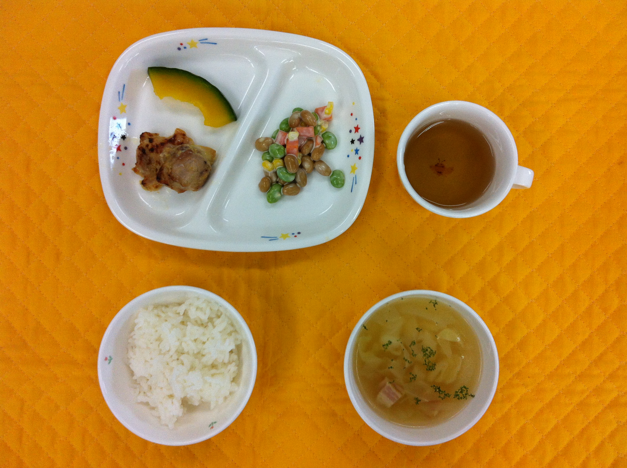 今日の給食は、タンドリーチキンです。チキンに塩コショウをし、プレーンヨーグルト、カレー粉をまぶしオーブンでこんがりと焼きました。カレーの風味が食欲をそそります。園で採れたかぼちゃを添えました。コロコロサラダには、大豆、枝豆、人参、コーンをマヨネーズ、醤油で和えました。 |
