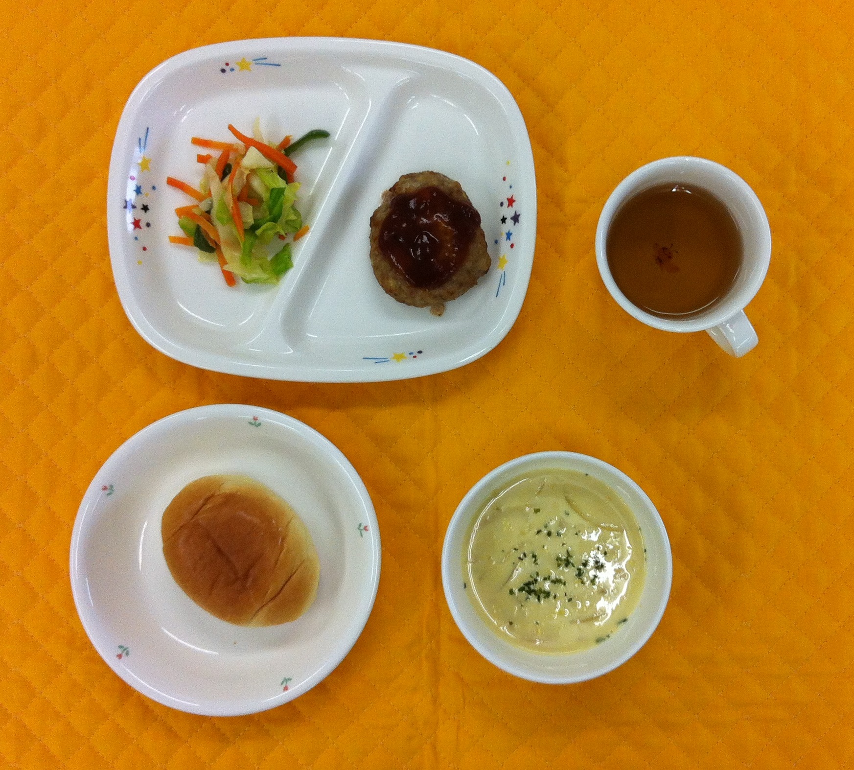 今日は、豆腐ハンバーグでした。子どもたちは、豆腐が入っていることに気づいていたのかな?私が見てる限り普通のハンバーグのように食べていました。また、パンをコーンスープにつけて楽しみながら食べていいる子もいました。 |