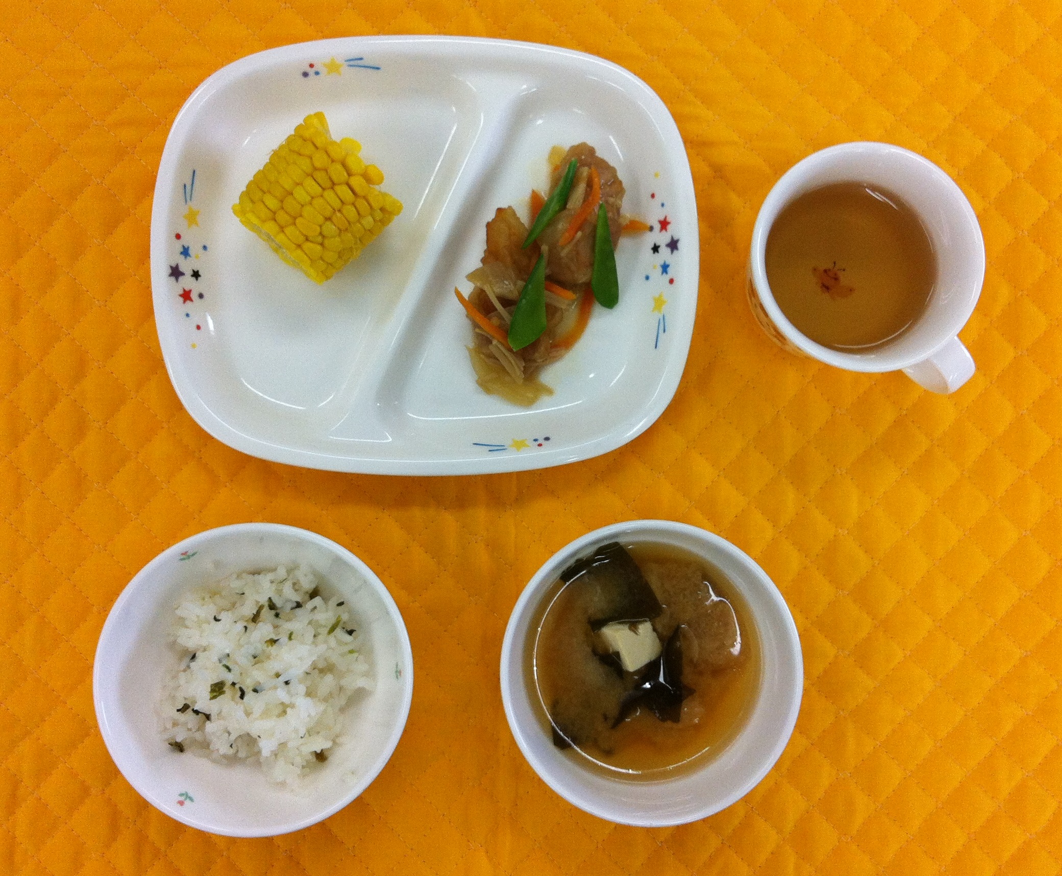 今日の給食は、『鶏のから揚げ 野菜あんかけ』です。白ご飯を菜飯にすると、子どもたちはよく食べます。8月も残り1週間ですが、まだまだ暑い日が続きそうです。しっかり給食を食べて、体力をつけましょう。