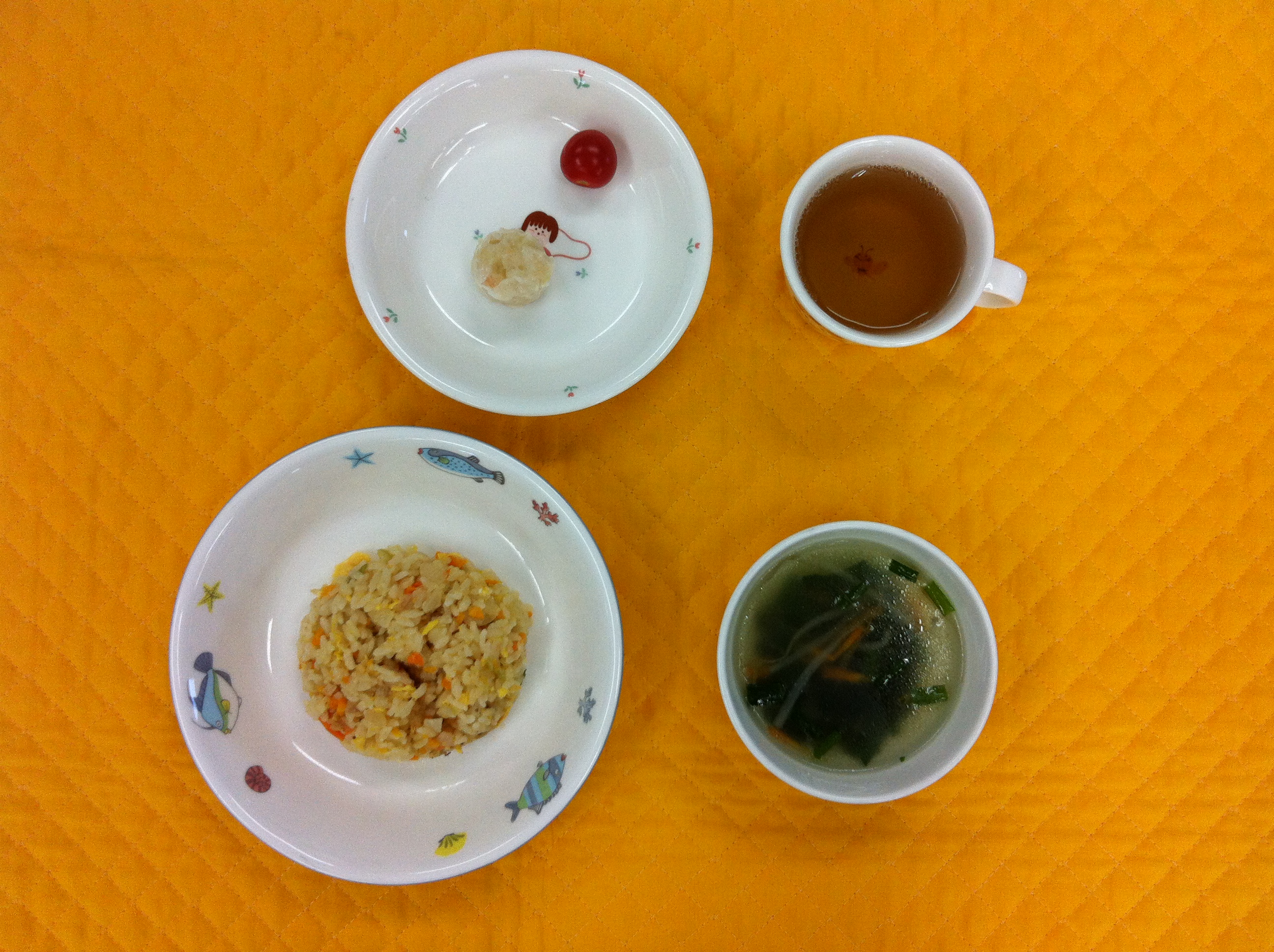 今日の給食は、ツナ炒飯です。ニンジン、玉ねぎ、ネギ、卵、ツナが入っています。ツナの旨みがでて美味しく出来上がりました。スープには、もやし、ニラ、人参、わかめと具沢山に中華味に味付けしました。