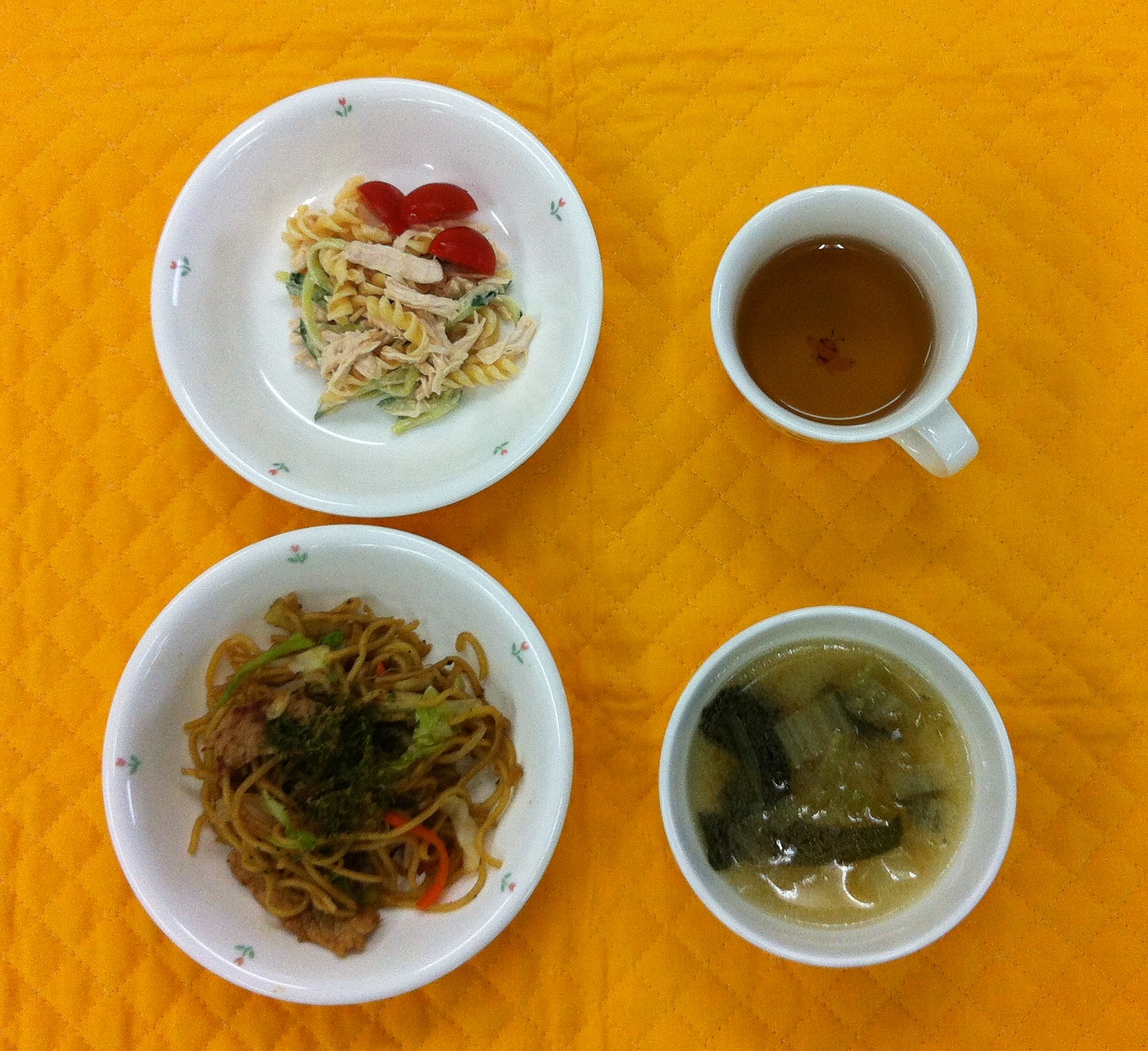 今日は、ソース焼きそばです。麺類の日は、子どたちが楽しみにしている日でもあります。焼きそばは、特に人気があるメニューの一つです。女の子もおかわりをしてモリモリ食べていました。 |