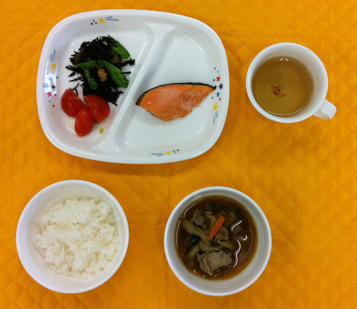 今日は、「和食」をテーマにした給食でした。和食といえば、みそ汁とご飯ですね。豚汁の味噌は、愛知県らしく赤みそが使われていました。子どもたちは給食に出された『ひじき』を残さず食べていました。ネイティブ教員も『ひじきが大好きです♪』と言っていました。なお、豚汁の具に使用したナスと付け合せのトマトは、園内菜園で収穫した野菜です。