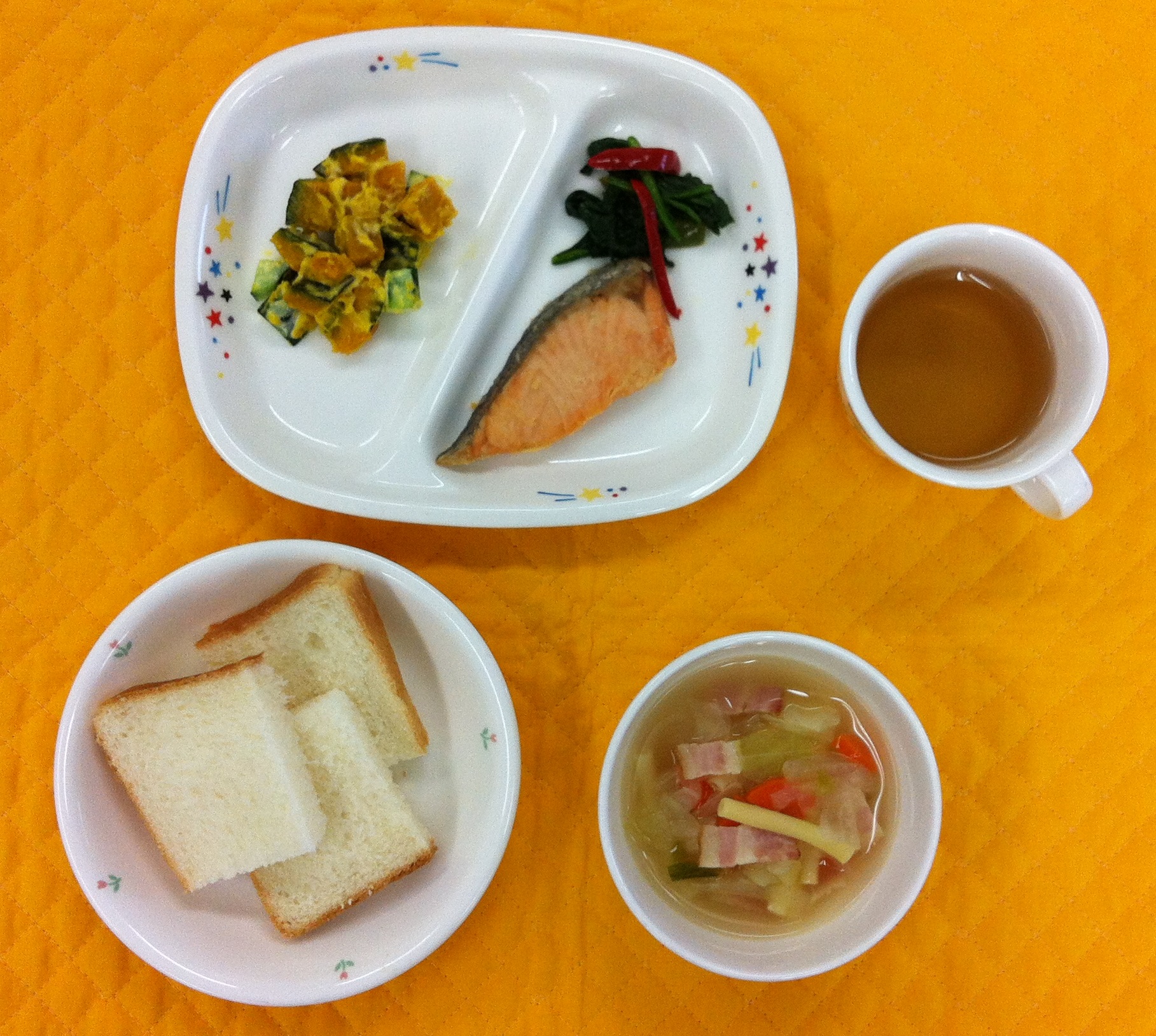 今日の給食は、鮭のムニエルです。パンはお好みでトーストして、バターを塗って食べられるようにしています。