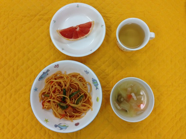 今日の給食はナポリタンです。子ども達に人気でよく食べていました。コンソメスープには、じゃがいも・人参・しめじ・キャベツにベーコンが入りました。
