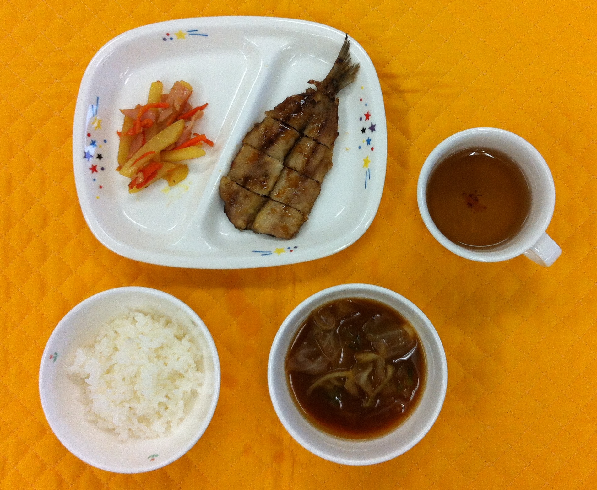 今日の給食は、本園では初めて出される『イワシの蒲焼き』です。骨がある魚をあえて給食に出すことで、上手に魚が食べられる子どもの育成を図っています。みんな、上手に食べていました。