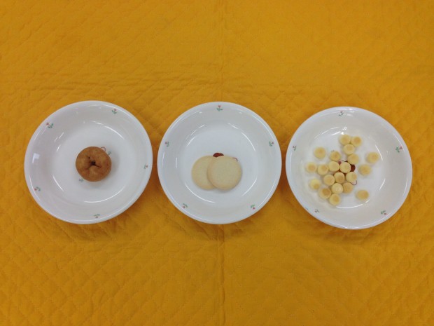 今日のおやつは、左:満2・2歳ベビードーナツ、中:3歳豆乳クッキー、右:5歳かぼちゃボーロです。