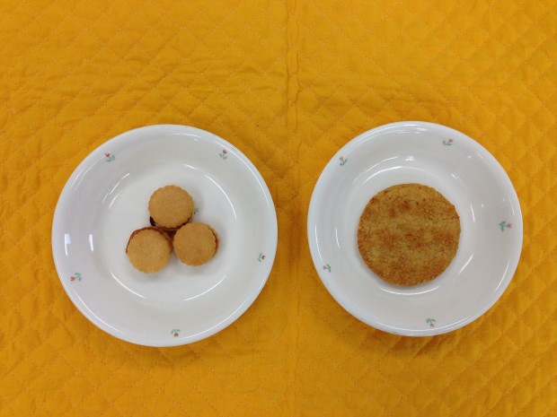 今日のおやつは、左:2・4・5歳りんごジャムサンド、右:3歳つぶぜんべいです。