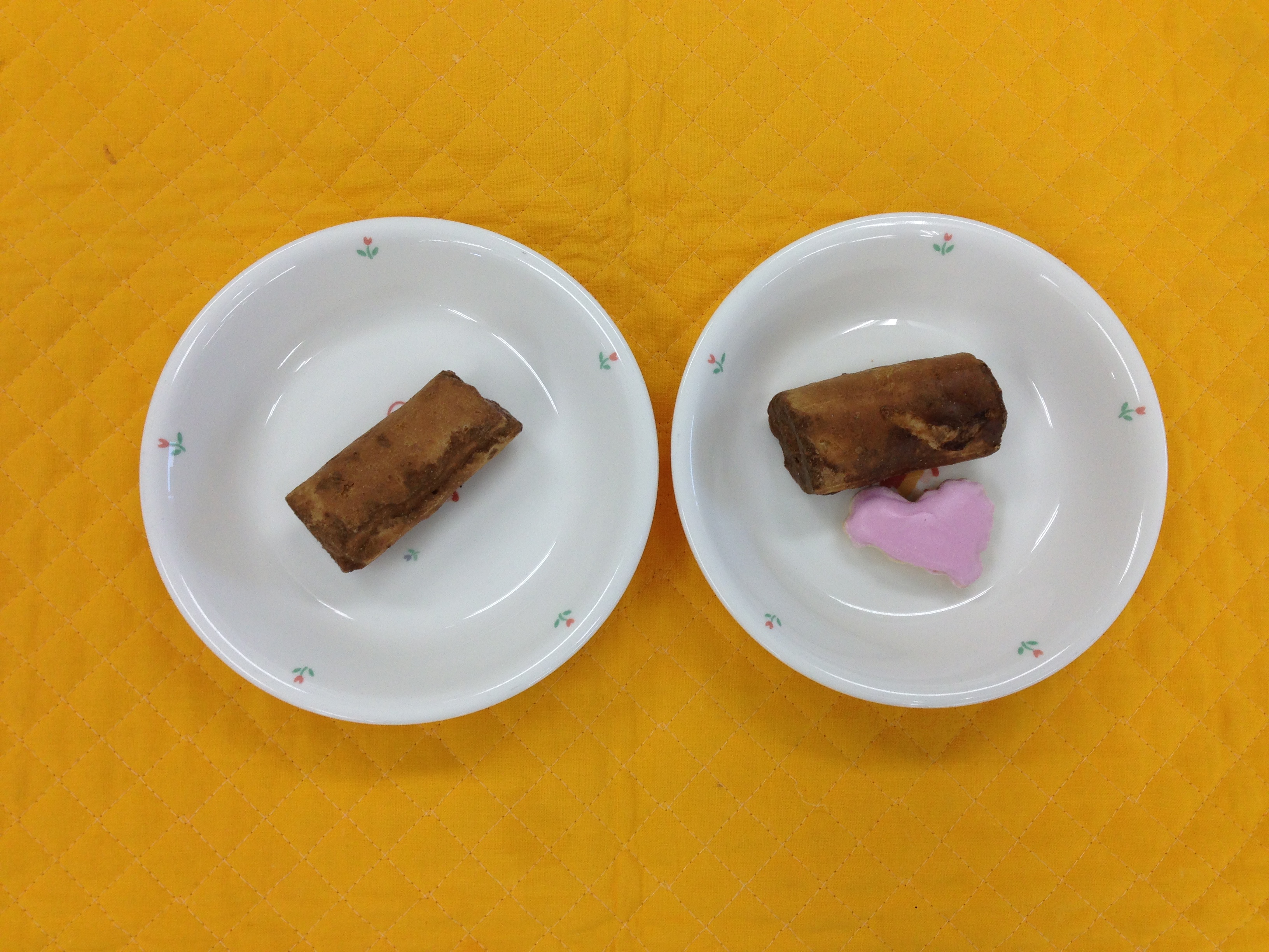 今日のおやつは2・3歳児は麩菓子で、4・5歳児は麩菓子と動物ビスケットです。