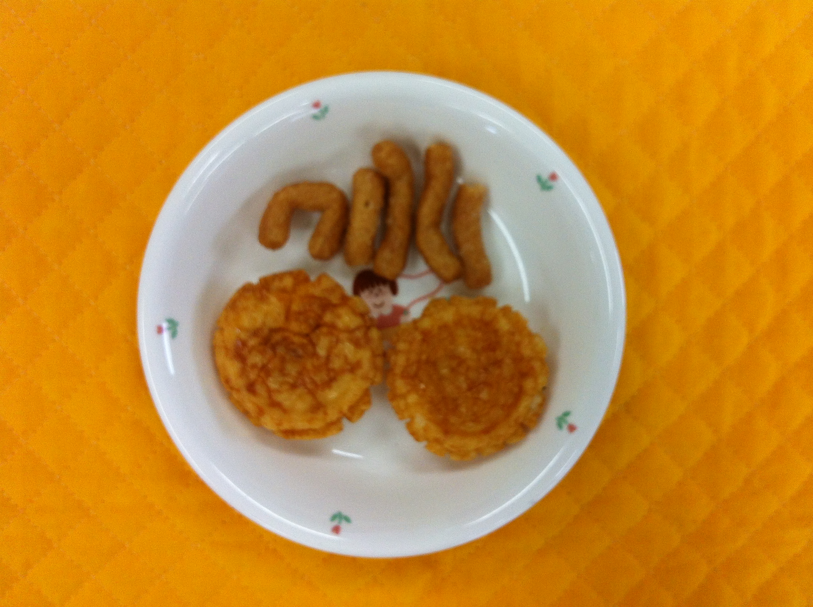 今日のおやつは、歯ごたえがあるせんべいと、かりんとうです。