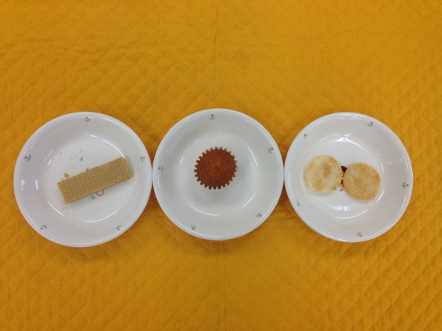 | おやつ献立 | 右:満2・2歳・3歳 野菜ウエハース、中央:4歳 プレーンマドレーヌ、左:5歳 ザラメせんべい |