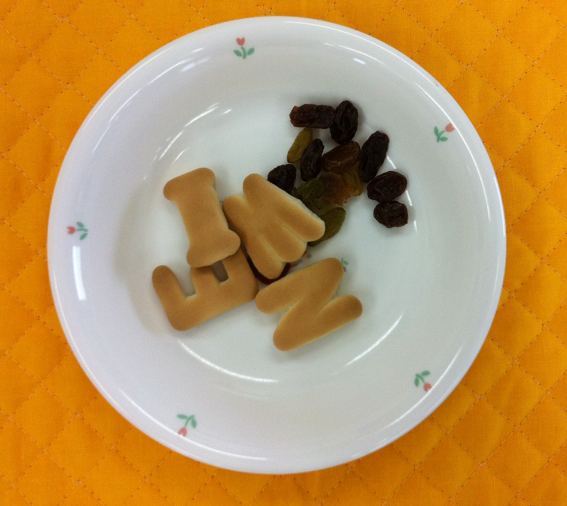 今日のおやつは、かわいいアルファベットのクッキーとレーズンです。