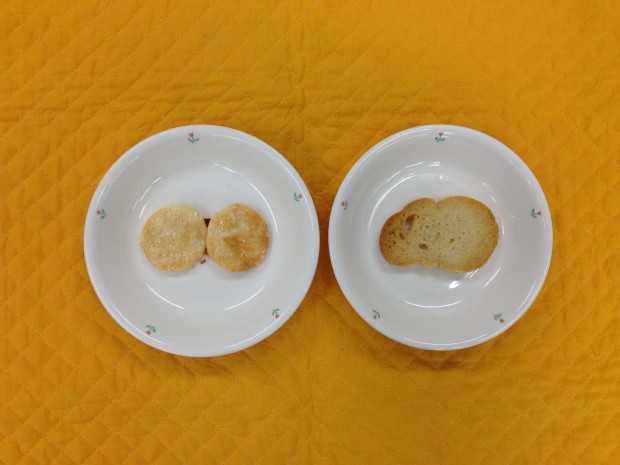 今日のおやつは、満2歳、2歳はざらめせんべい、3、4、5歳はラスクです。