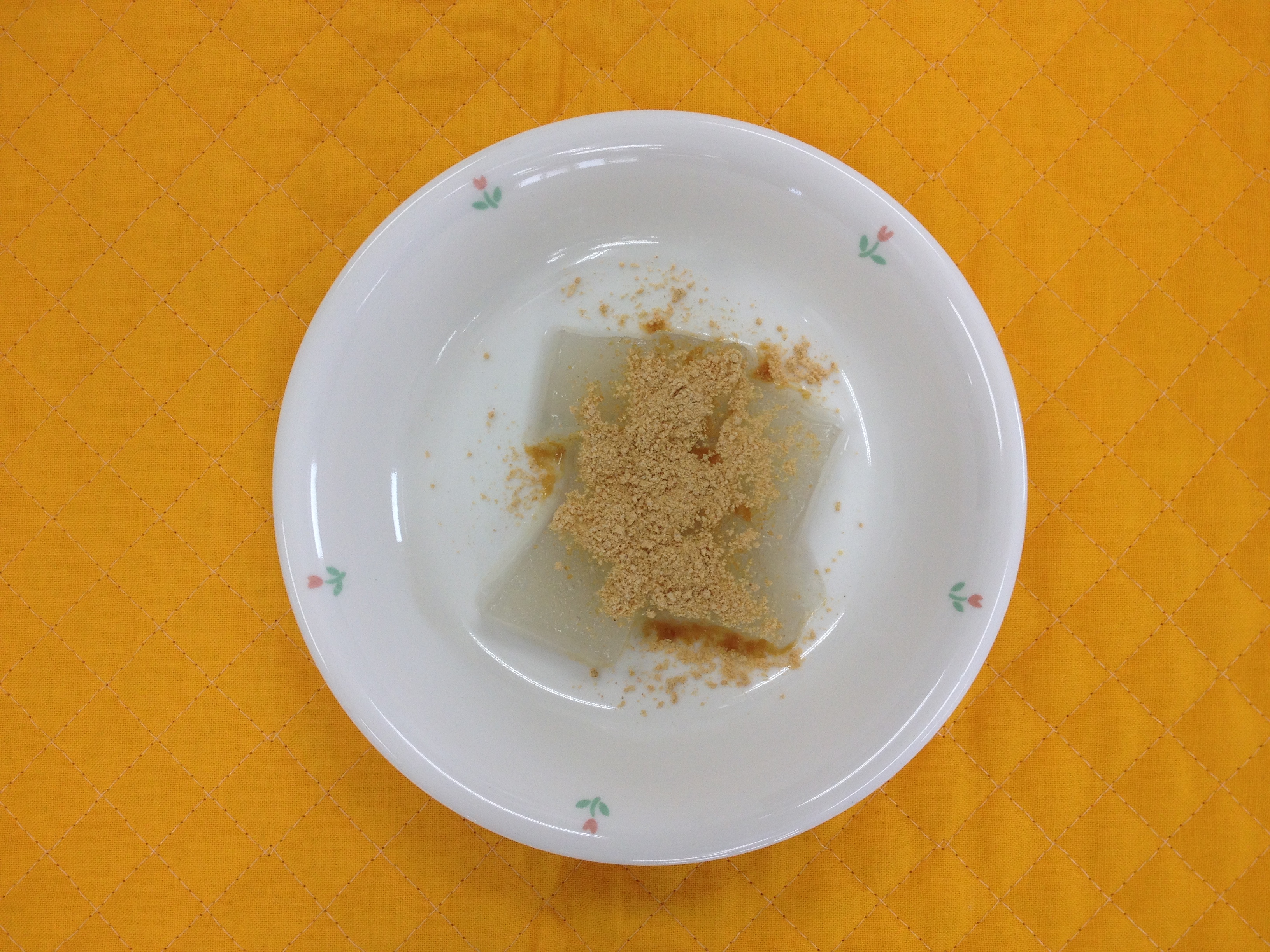 今日は、手作りわらびもちです。わらびもちにもほんのり甘味をつけ、上からきな粉をかけました。