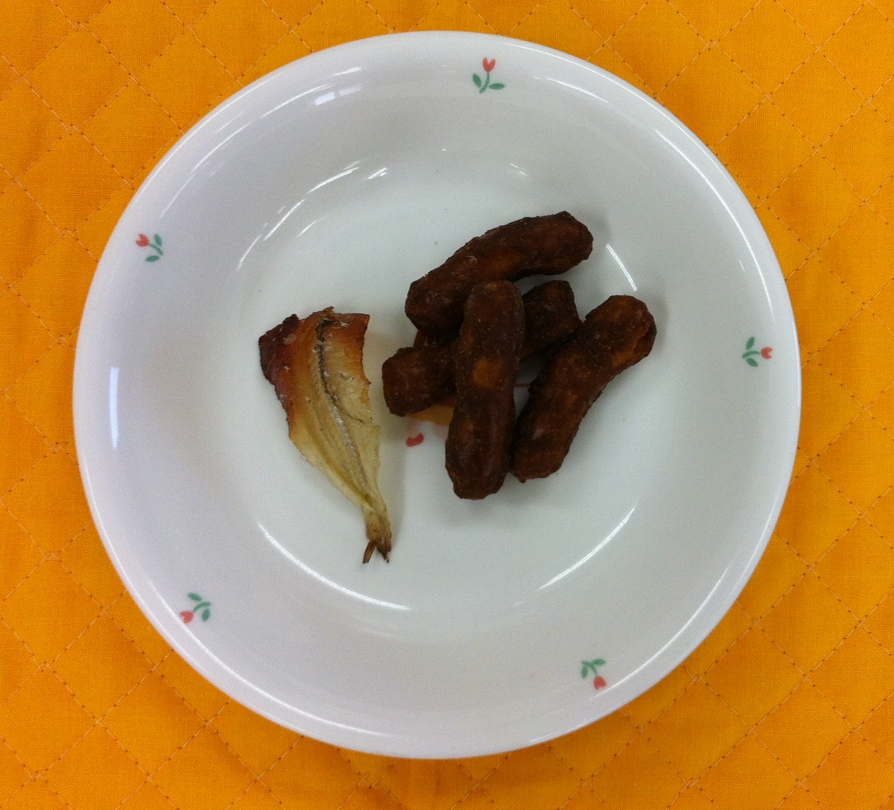 今日は、定番の黒砂糖かりんとうとイワシせんべいです。イワシせんべいはよく噛むことのできるおやつです。