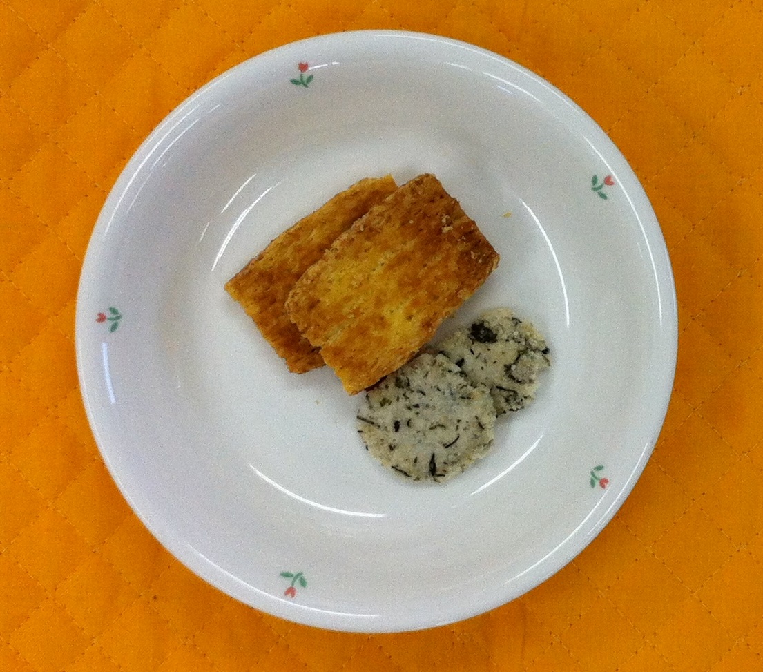今日のおやつは、パイとワカメせんべいです。和と洋の両方を味わえます。