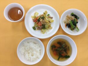 | その他 | 今日の給食は回鍋肉でした。回鍋肉には豚肉、人参、キャベツ、ピーマン、しいたけが入っており、和え物とお汁も野菜が沢山で栄養たっぷりの給食でした。 | |