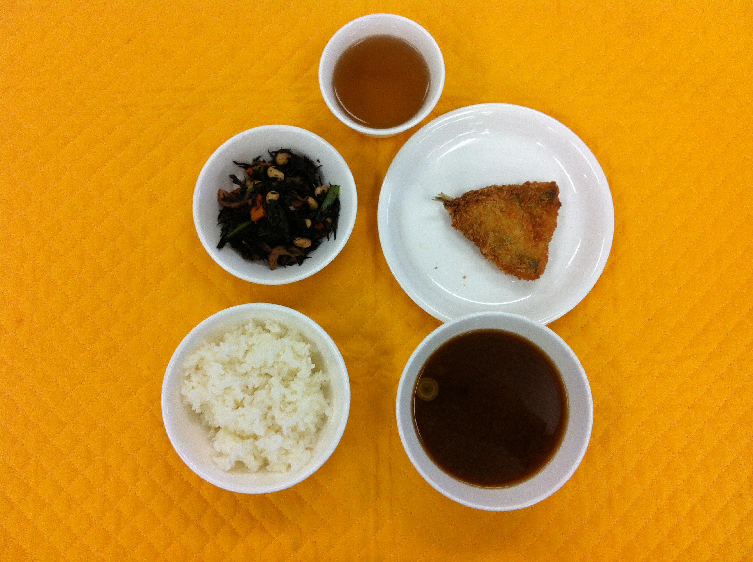 今日の給食は、アジフライとひじきの煮物です。ひじきの煮物には、人参、大豆、ちくわ、小松菜が入っています。 |