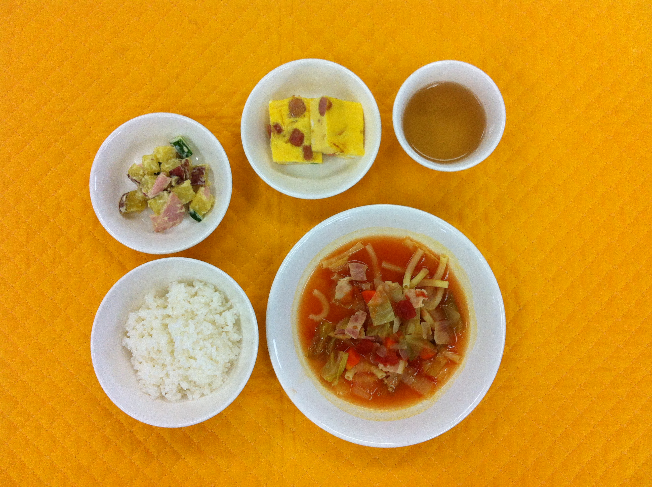 今日の給食は、ミネストローネです。ニンジン、玉ねぎ、キャベツ、ベーコン、マカロニが入っています。酸味が強すぎず、サッパリとした味付けになっています。さつま芋のサラダは、園の子どもたちが収穫したさつま芋をたっぷり使い、キュウリ、ハムと一緒にマヨネーズで和えました。 |