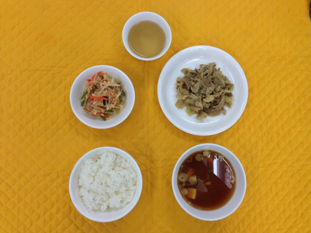 今日の主食は、生姜・ニンニクで香りを出し、塩・こしょう・カレー粉をふりかけた豚肉を炒め、最後にりんごジャムであえました。サラダには、大根・人参・きゅうり・ピーマンをボイルして、炒り卵・カリカリベーコンを入れ、みそ汁には、さつま芋・豆腐・ネギが入っています。 |