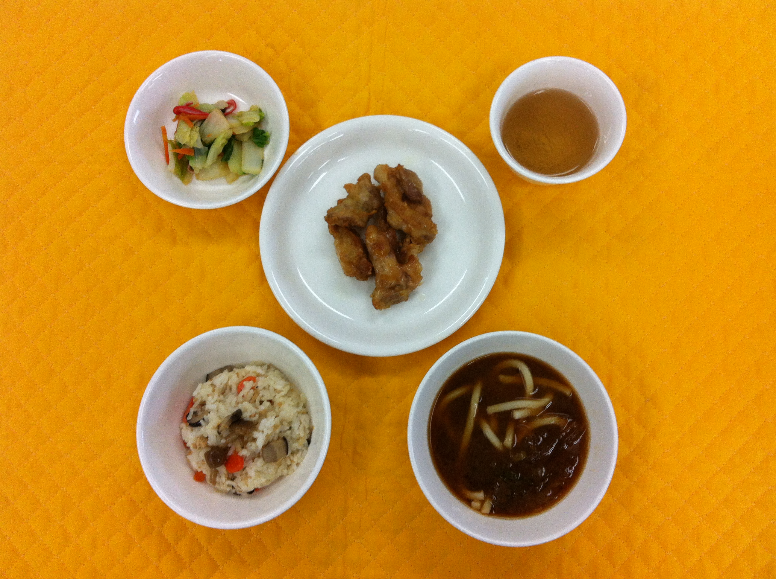 今日の給食は、大人気メニュー鶏の唐揚げです。シンプルに、醤油、酒、生姜、ニンニクの味付けです。カリッとオーブンで揚げ焼きにしました。旬のきのこをふんだんに使いきのこご飯にしました。給食も秋メニューになってきました。 |