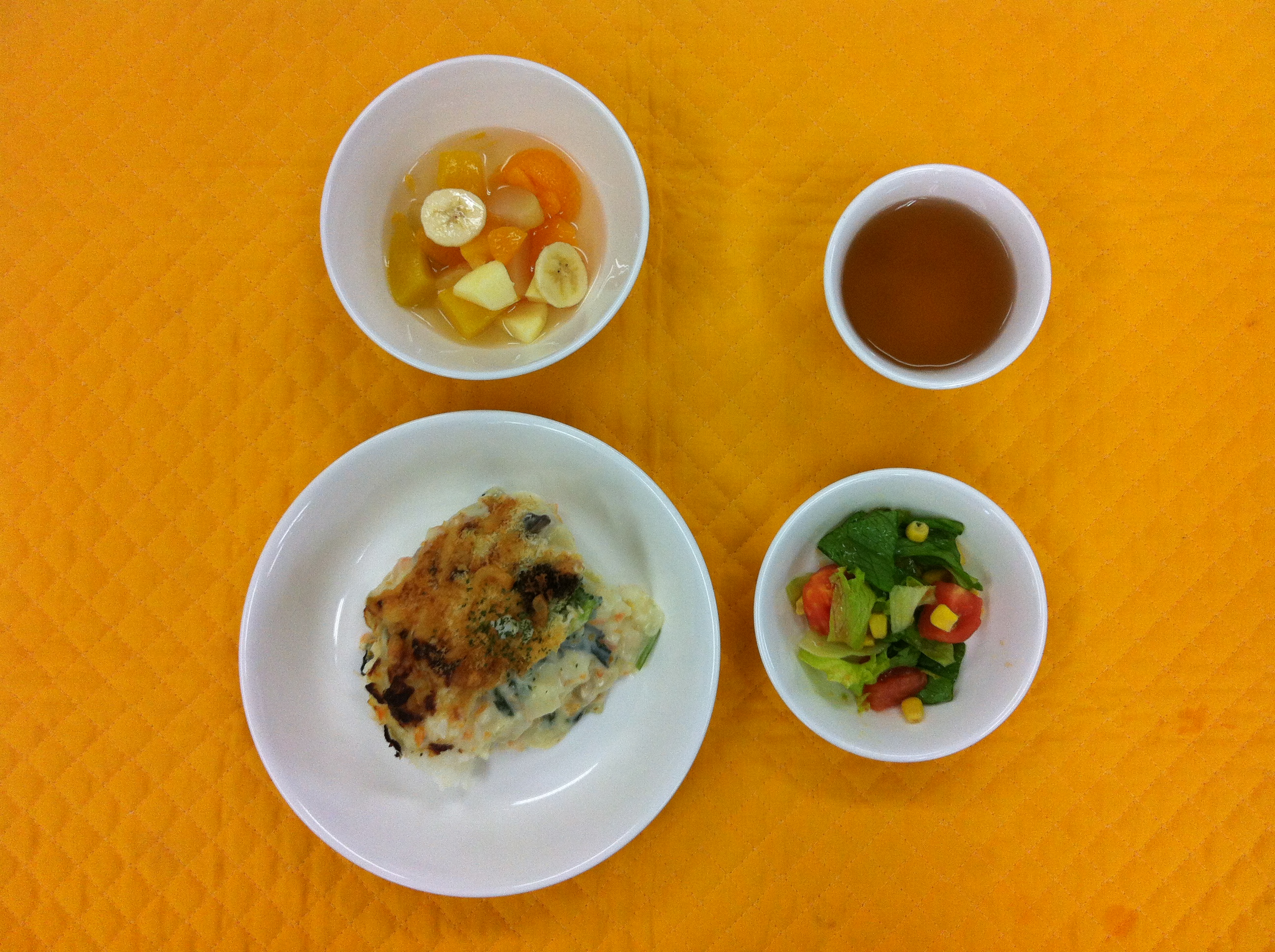 今日の給食は、チキンドリアです。鶏肉とにんじん、たまねぎ、小松菜、マッシュルーム、ブロッコリーが入っています。サラダはレタスとトマトとコーンのサラダです。オリーブオイルと酢と塩、砂糖でサッパリとした味付けになっています。 |